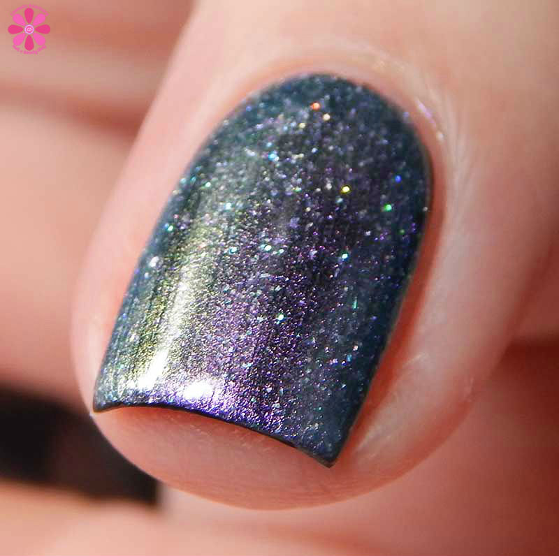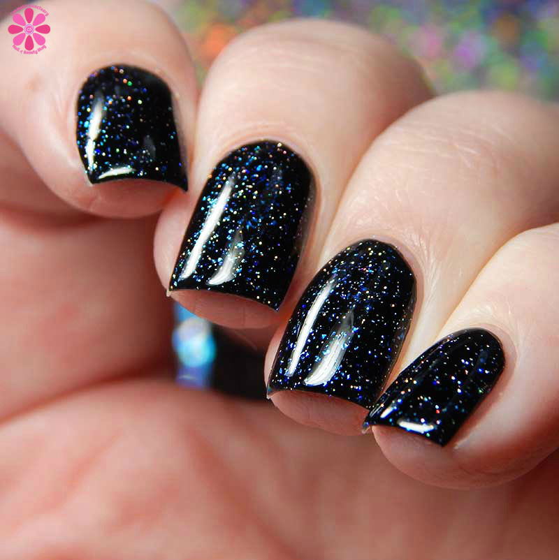 Next Time You Think You’re Perfect, Try Walking On Water is a clear base with iridescent blue flecks and silver holographic microglitters. I used 1 coat over a black creme for these photos.
