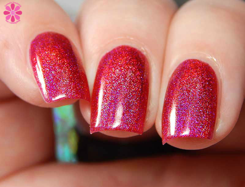 I saved my personal favorite for last! Crazy Mod Love is a red leaning berry pink linear holographic. The base on this one is more jelly like, so it required 3 thin coats for me.