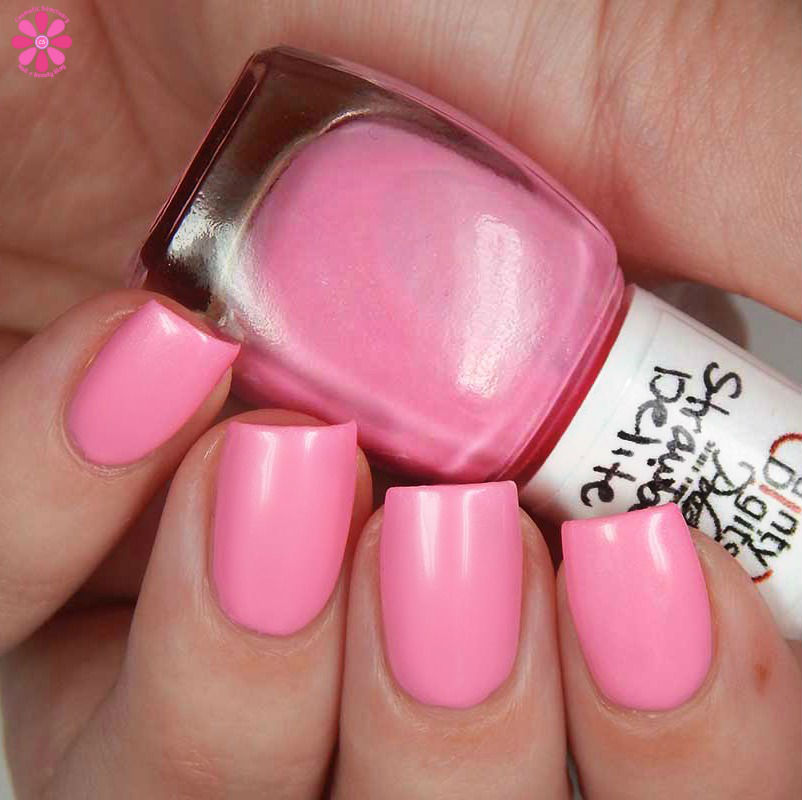 Strawberry DeLite is a bright but mellow pink creme and is a light strawberry scent. I used 2 coats and a glossy top coat for these photos.