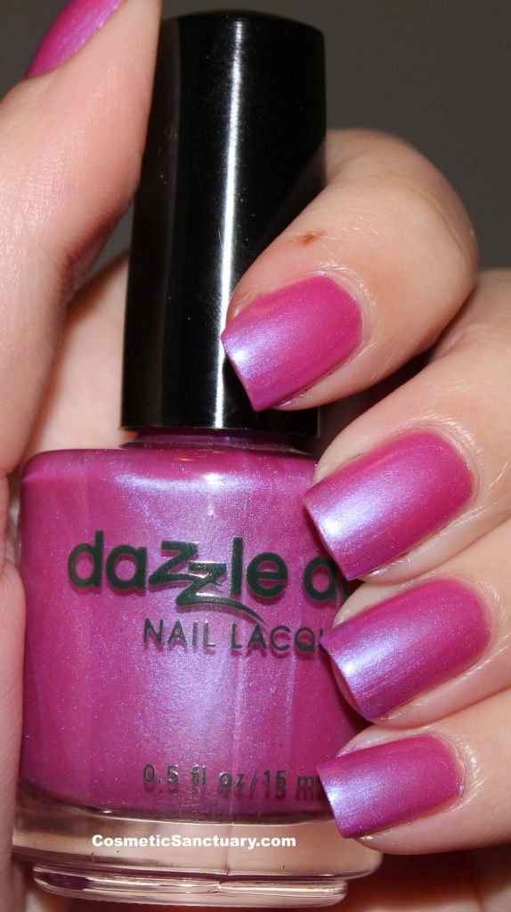 Calypso Romance is hands down my favorite of the 3 colors. It is a gorgeous pinky purple shade with a very subtle blue shimmer. Calypso Romance GLOWS on the nail. I was fascinated by it. For the photo I did not use the Dazzle Dry top coat so you could see the finish of Dazzle Dry. It dries to a satin finish, and for Calypso Romance, I think the finish is perfect for it. I used two coats of Calypso Romance for this photo.