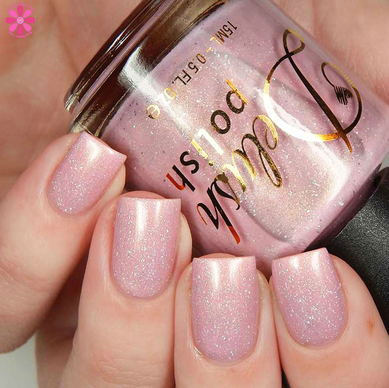 Call Me On My Shell Phone is a baby pink with a glowy gold shimmer and silver holo flakes mixed in. Super girly and I love it! I used 2 coats and a glossy top coat for these photos.
