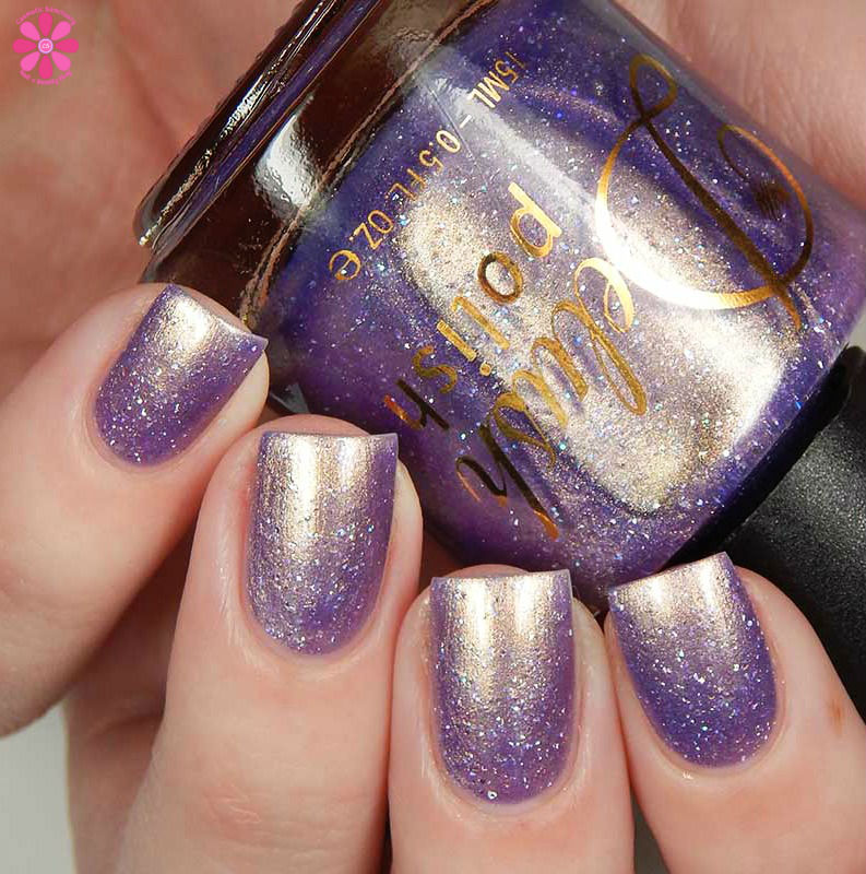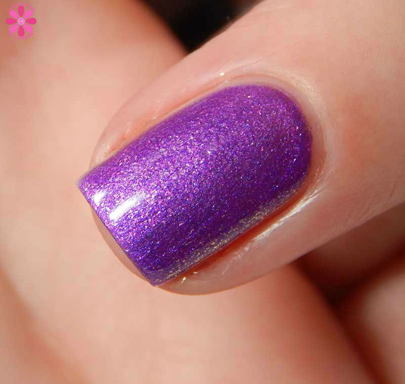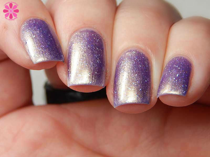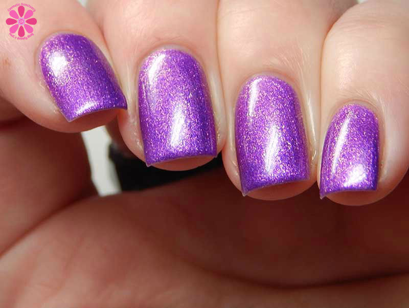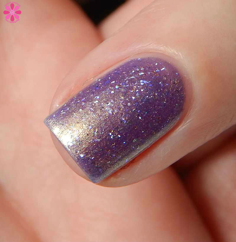 Siren Of The Seas is a vibrant lavender with gold shimmer packed in and holo flakes. I used 3 thin coats and a glossy top coat for these photos.