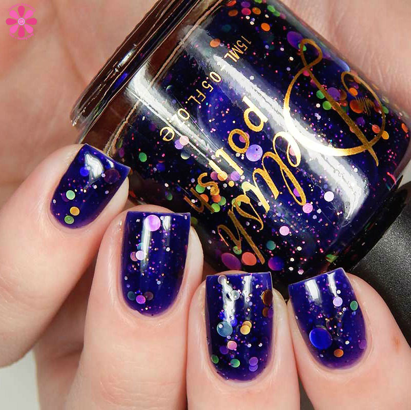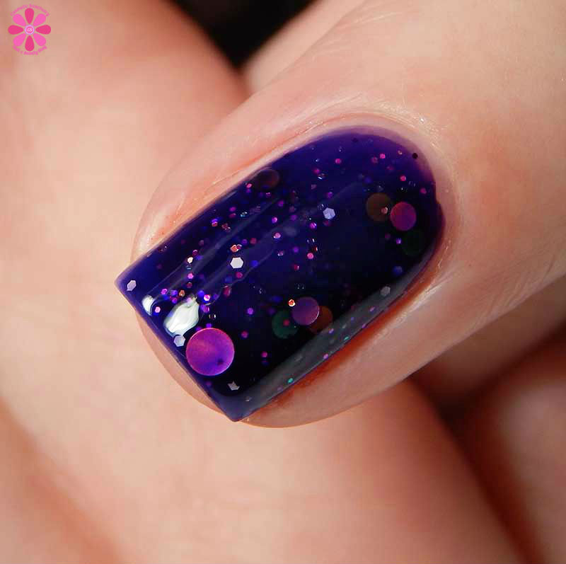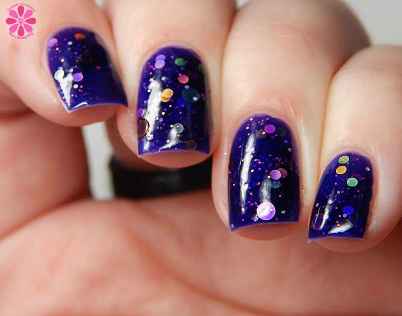 This is a gorgeous grape jelly base packed with pink, purple, blue, green, and yellow dot glitters in various sizes. I used 3 thin coats and a glossy top coat for these photos.