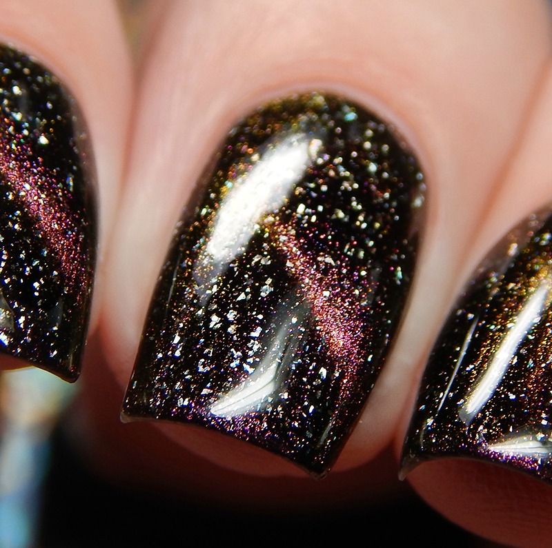 Abracadabra is a magnetic multichrome! Abracadabra is a blackened base with a pink to copper to gold magnetic multichrome shimmer pull with holographic microflakes. I used 3 thin coats and a glossy top coat for these photos.