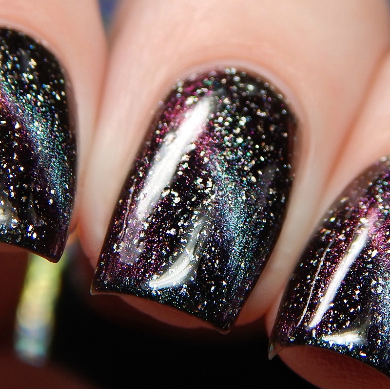 Alakazam is a blackened base with purple to blue to green magnetic multichrome shimmer pull with added holographic microflakes. I used 3 thin coats and a glossy top coat for these photos.