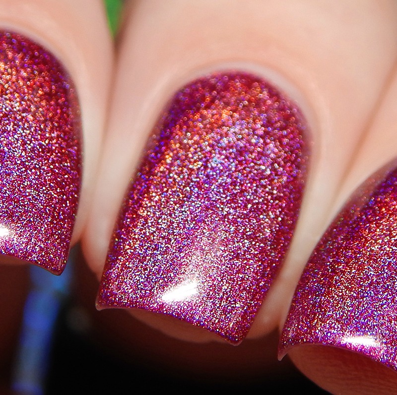 Hocus Pocus is a berry pink linear holographic with additional shimmer mixed in. The holo takes over, so it’s actually hard for me to identify what the shimmer color is since the holo is so intense. I used 3 thin coats and a glossy top coat for these photos.