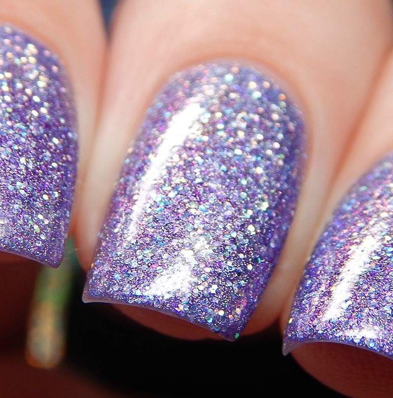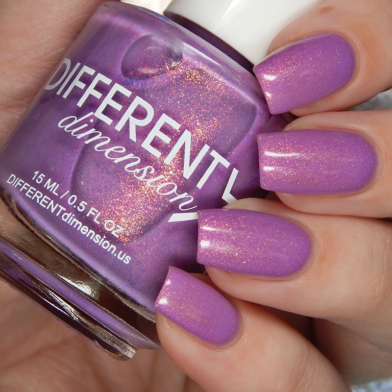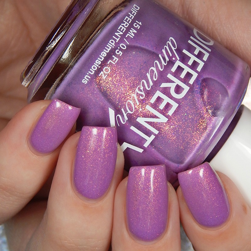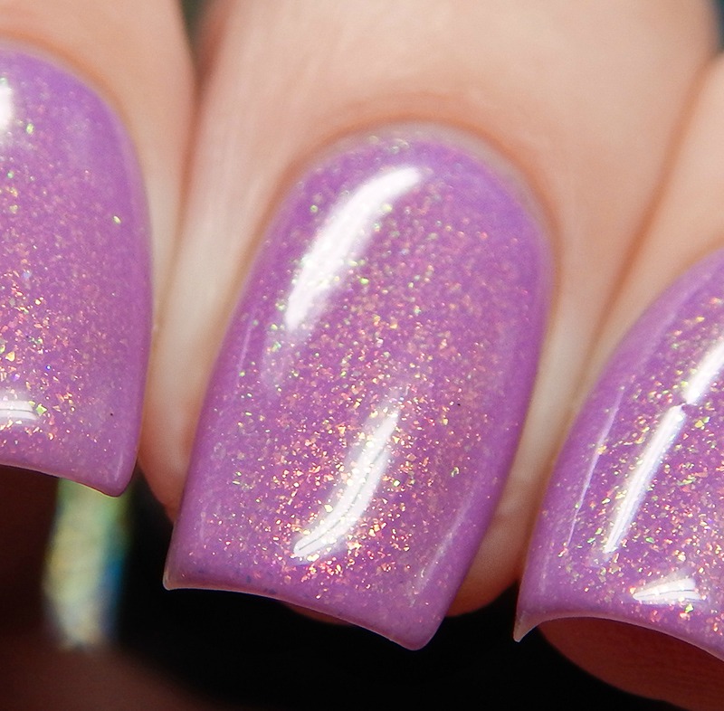 Illusion is a light orchid purple crelly base with unicorn shimmer that shifts red to gold to green. I used 3 thin coats and a glossy top coat for these photos.