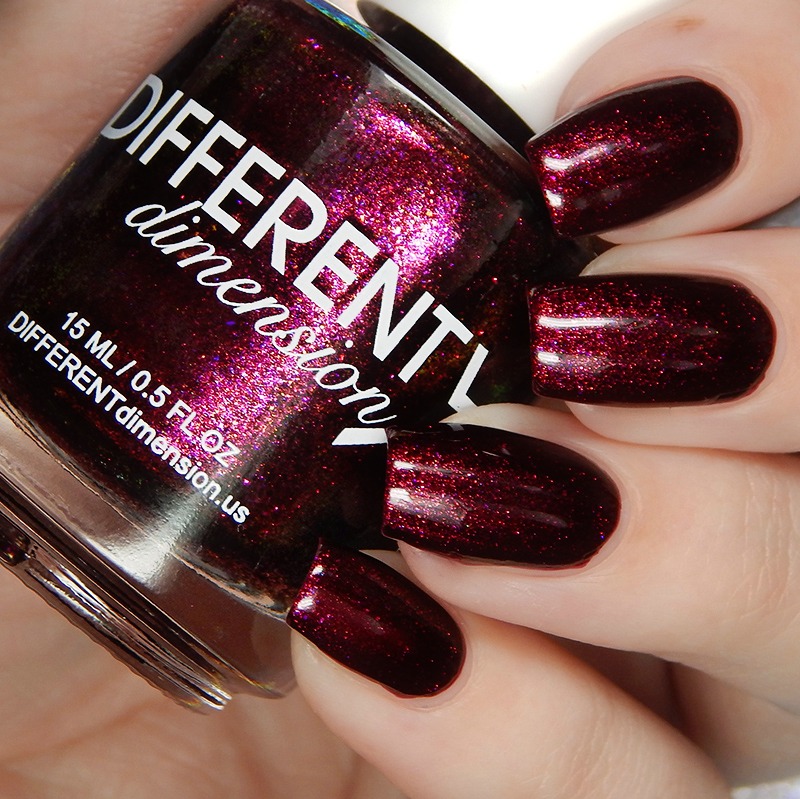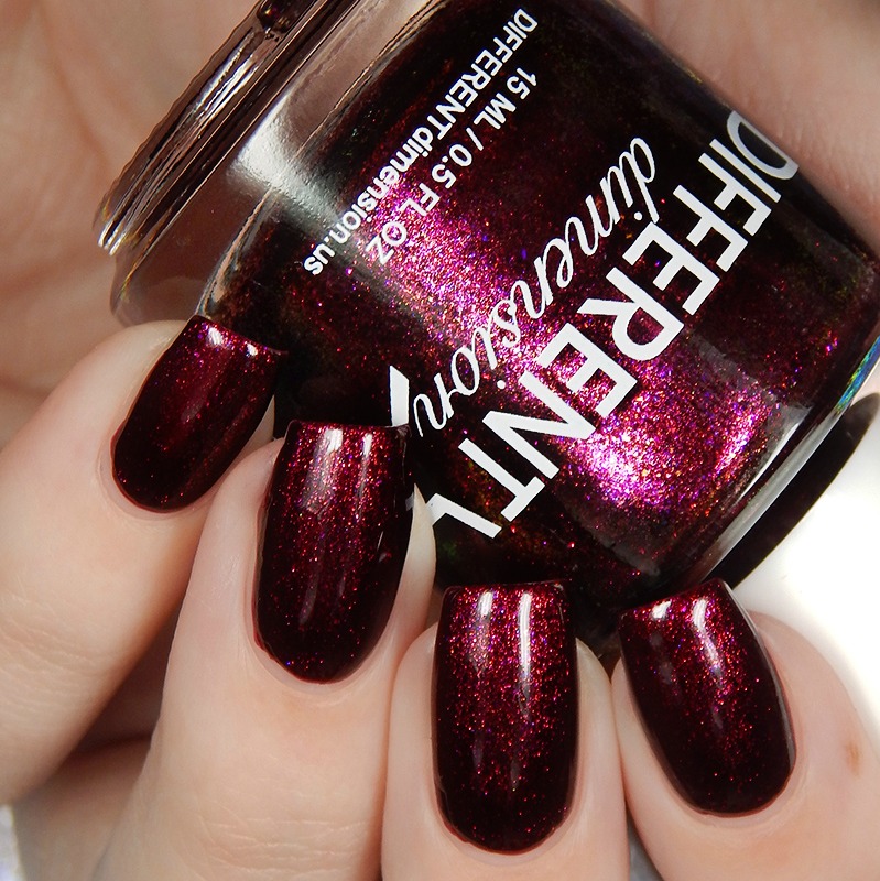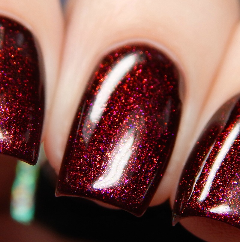Lumos is a deepened wine red base packed with ired to gold to green unicorn shimmers mixed in. I used 3 thin coats and a glossy top coat for these photos.
