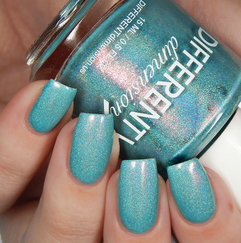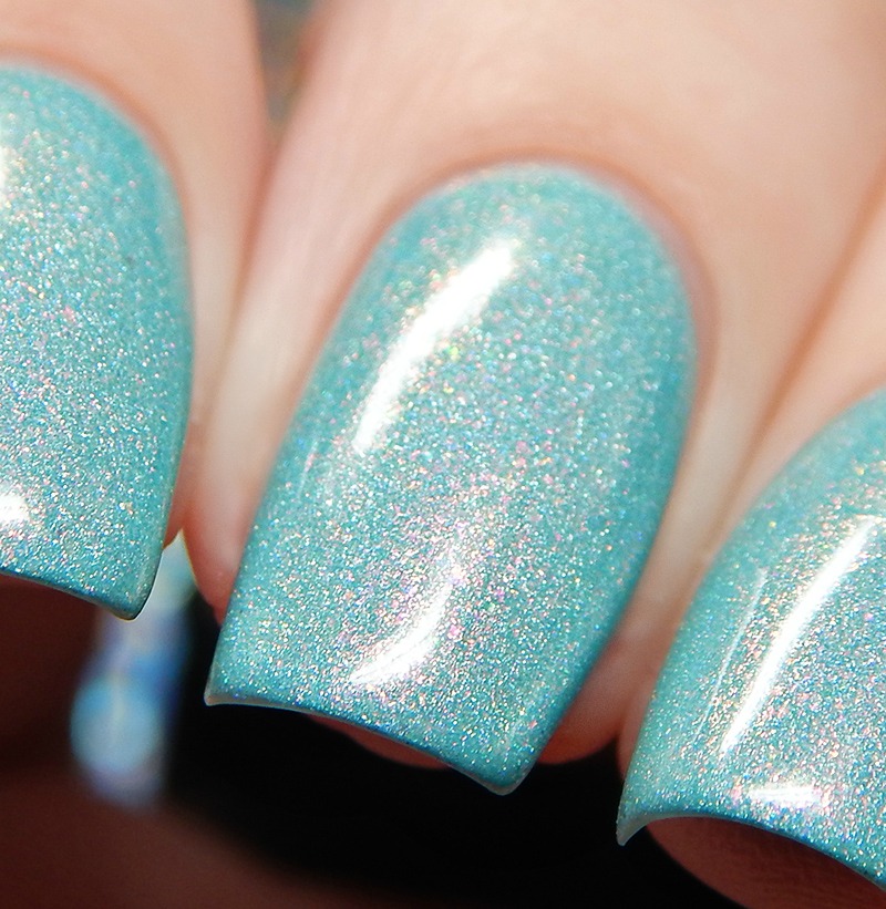 Now You See Me is a minty blue linear holographic creme with red to gold to green shifting unicorn shimmer added. I used 3 thin coats and a glossy top coat for these photos.