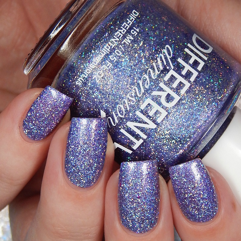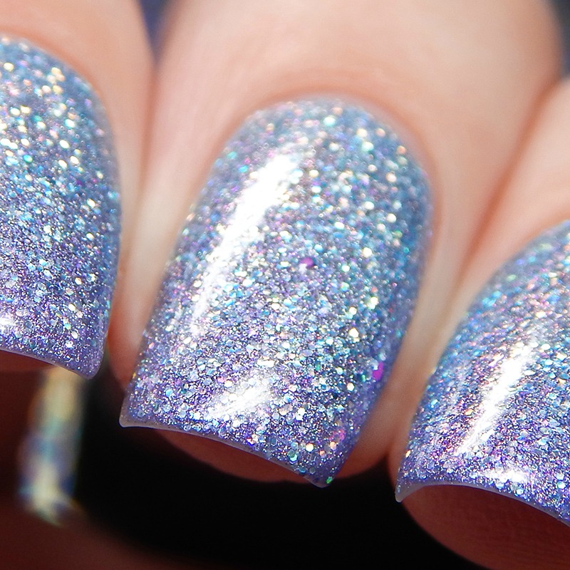Presto Chango is a thermal that transitions from cool toned purple while cold to a dusty medium blue while warm and is packed with unicorn shimmer and holographic microglitters. I used 2 coats and a glossy top coat for these photos.