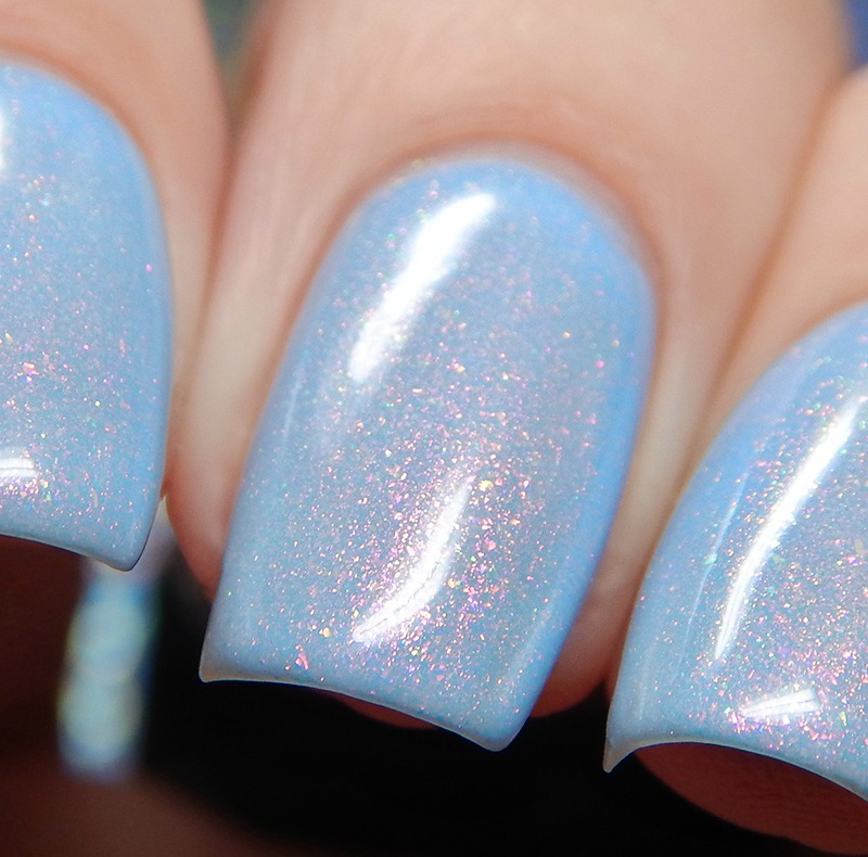 Voila is a vibrant baby blue crelly base with unicorn type shimmers that shift from red to gold to green mixed in. I used 3 thin coats and a glossy top coat for these photos.