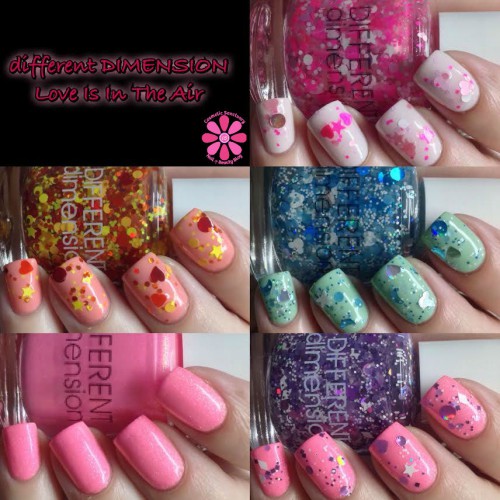 Today I have the Love Is In The Air Collection by Different Dimension! This 5 piece collection consists of 4 glitter top coats (one of which is Limited Edition!) and a glow in the dark matte like shade.