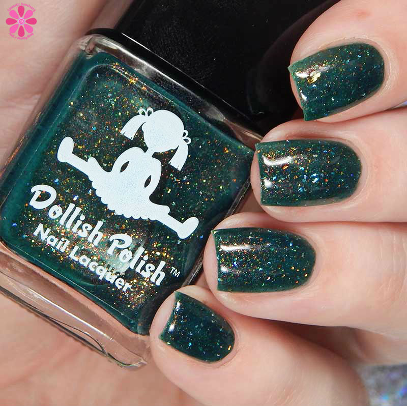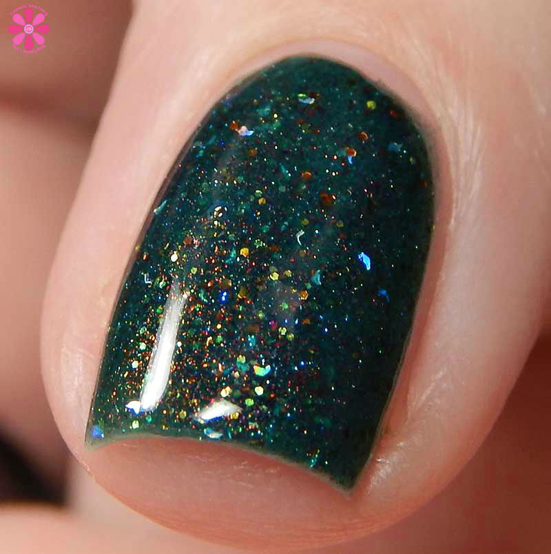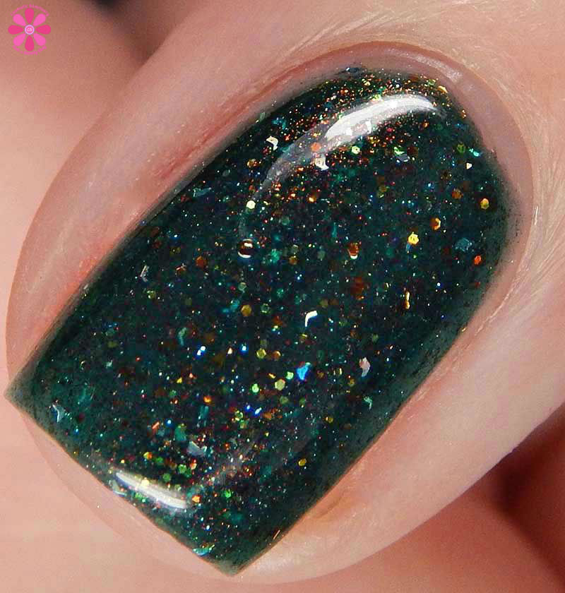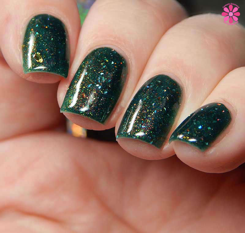 Dollish Polish Psithurism is a deep cool toned forest green jelly base packed with coppery red to gold shimmer, bronze and gold microglitter and silver holographic micro shreds. I used 3 thin coats and a glossy top coat for these photos.