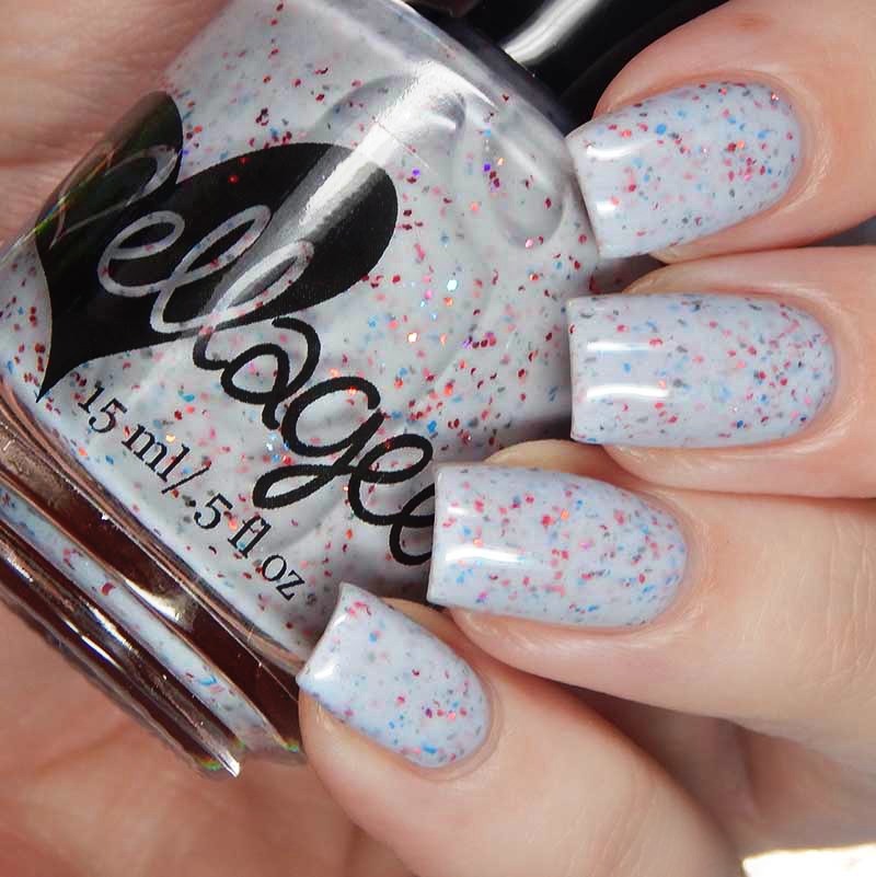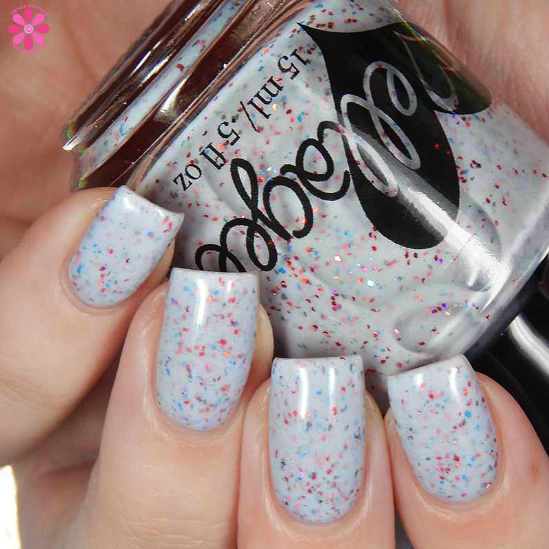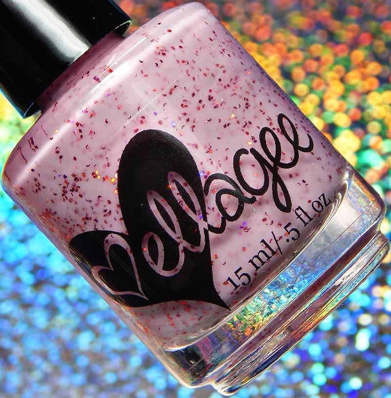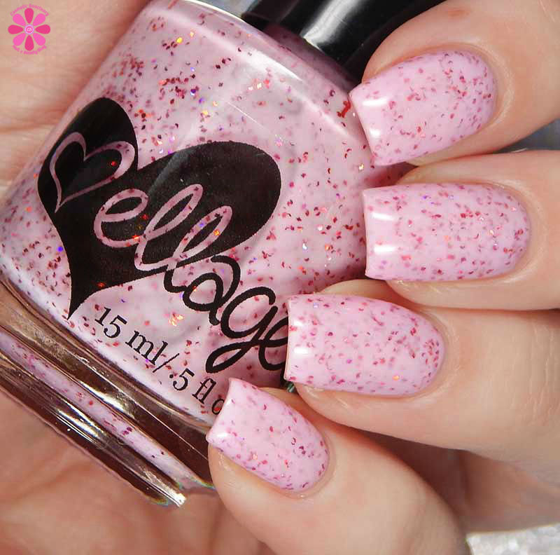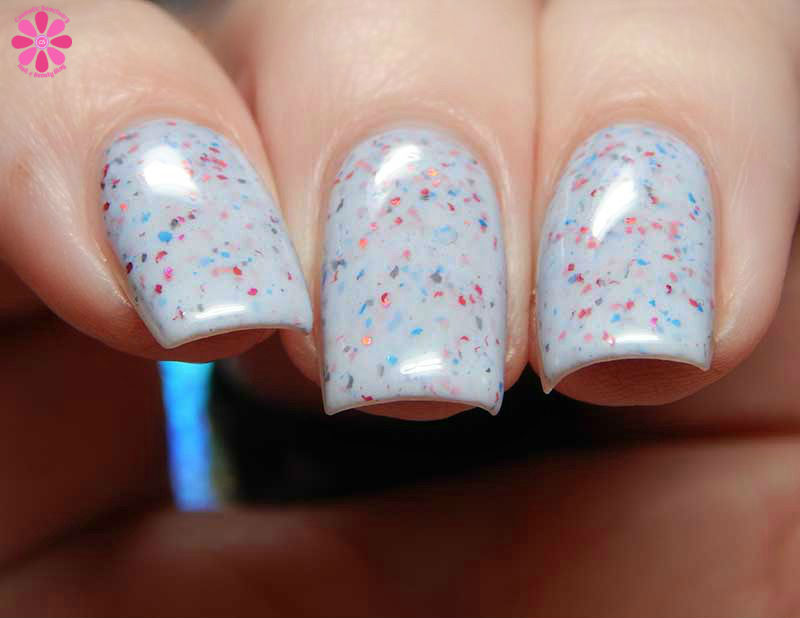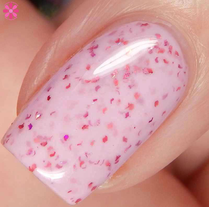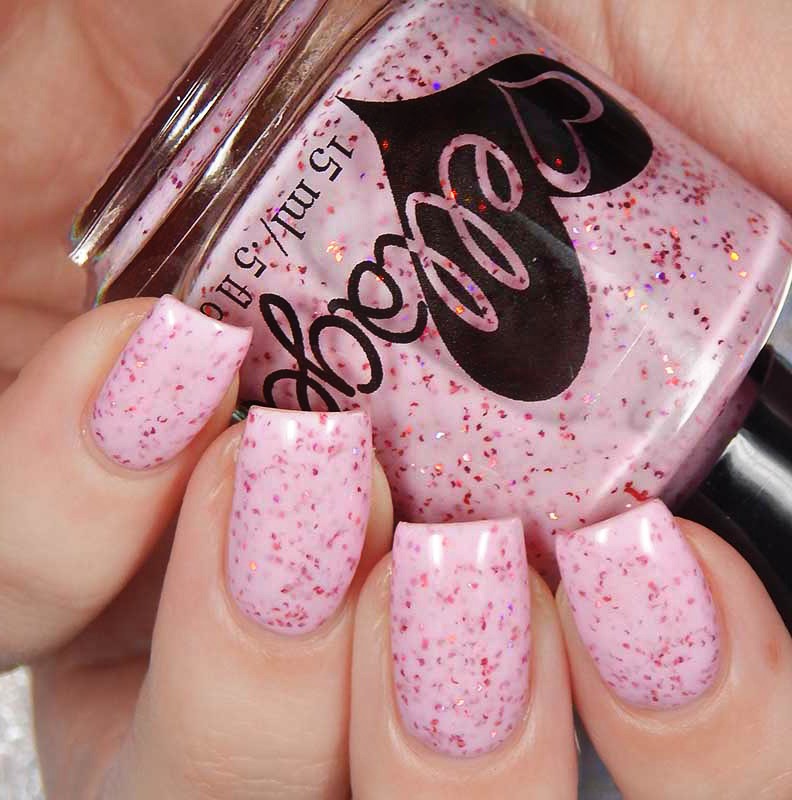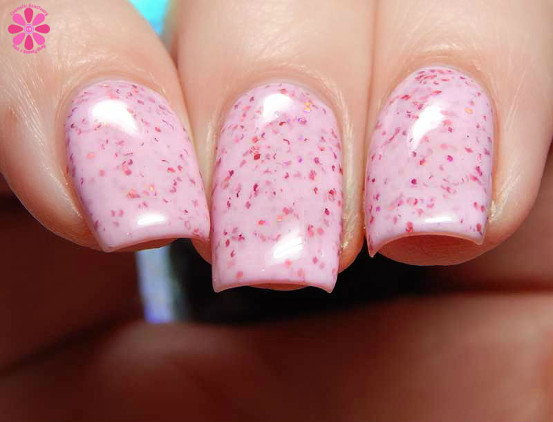 You Are Who You Eat reminds me of Valentine’s Day. This is a cotton candy pink crelly base with microflakes and microglitters in shreds of red, hot pink and a little red holographic. I used 3 thin coats and a glossy top coat for these photos.