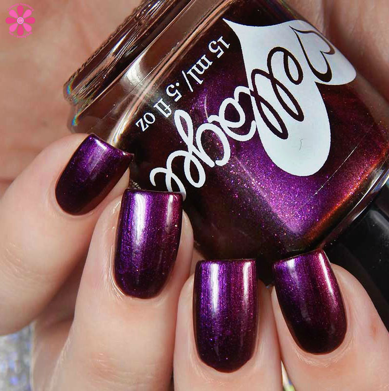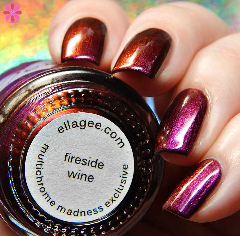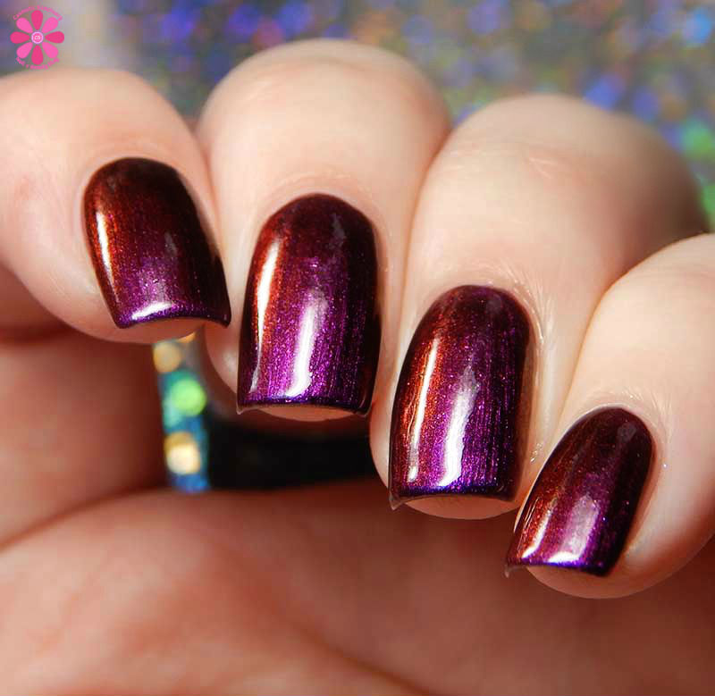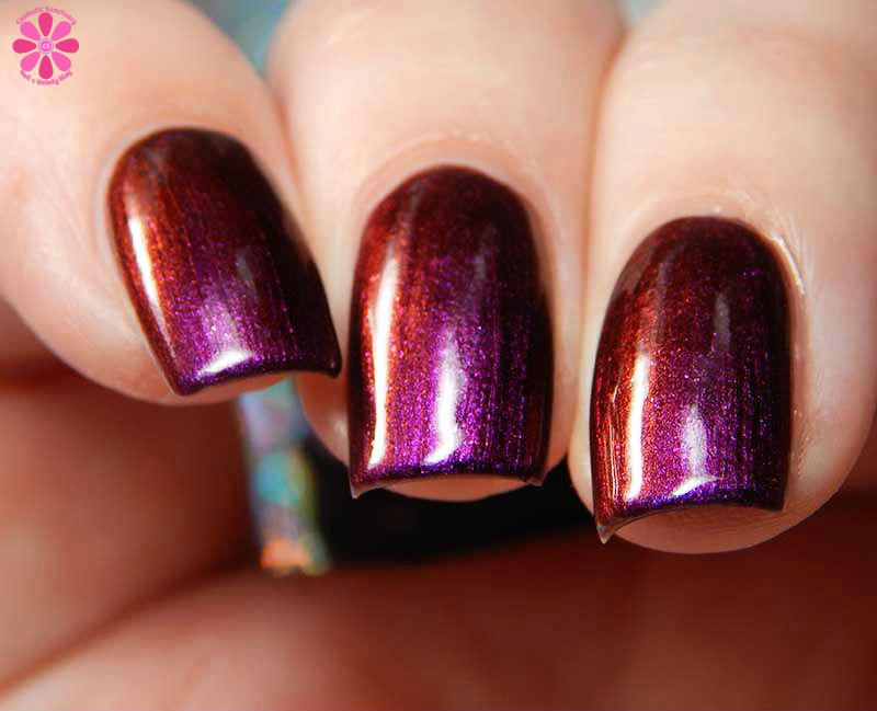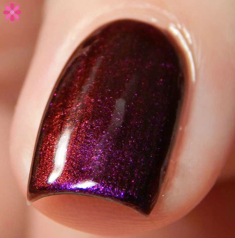 Fireside Wine is a magenta base that shifts to copper, red, fuchsia and violet. It also has a bright pink sparkle to it so it’s not a flat multichrome. I used 2 coats and a glossy top coat for these photos.