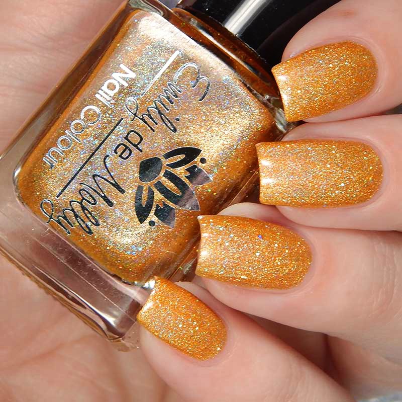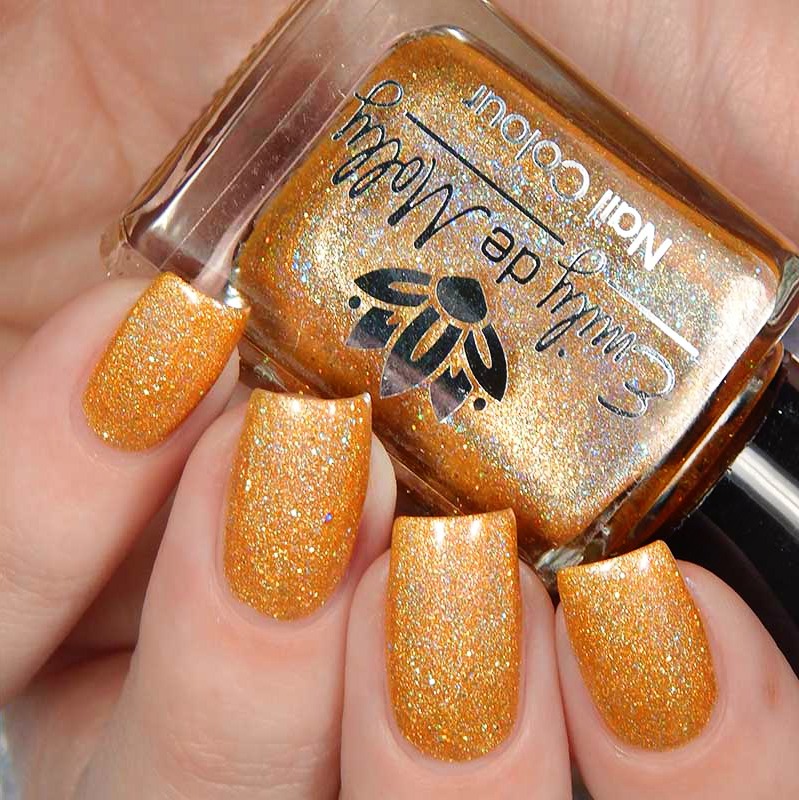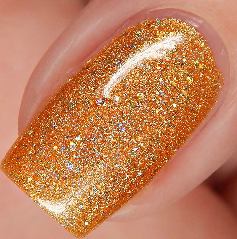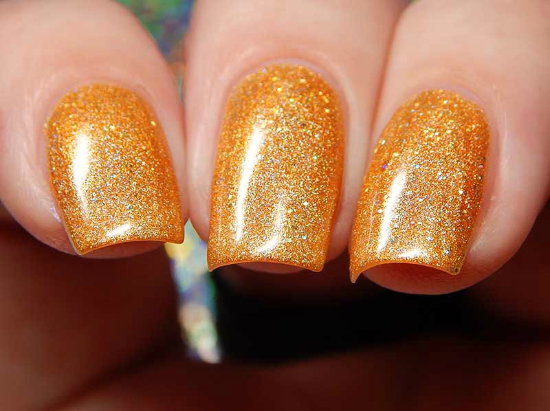 Art of Structure is a honeycomb orangish yellow holographic with silver micro glitters mixed in. I used 2 coats and a glossy top coat for these photos.