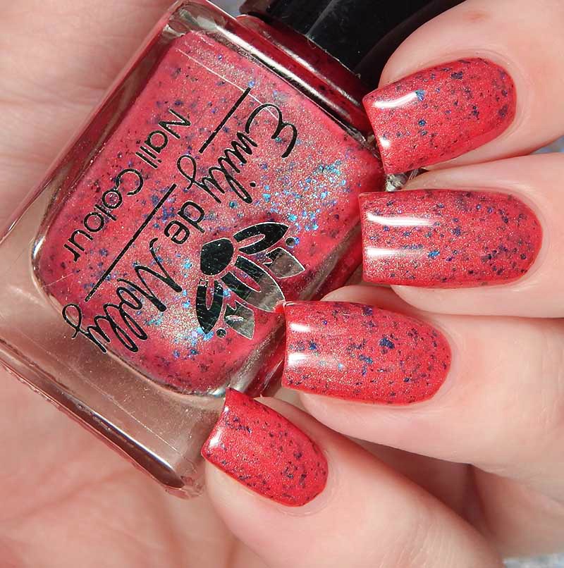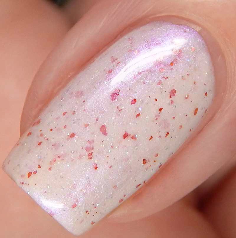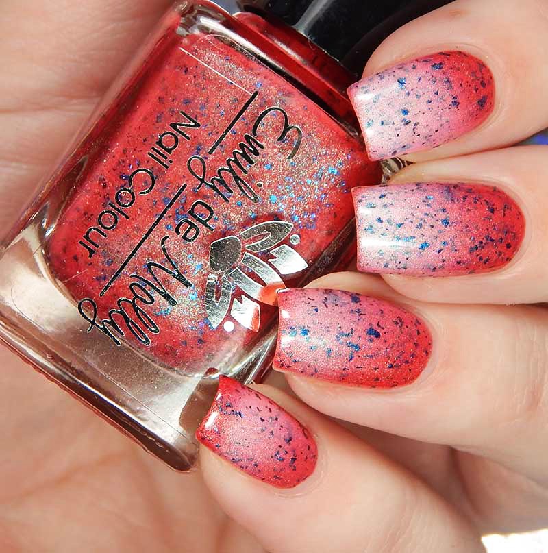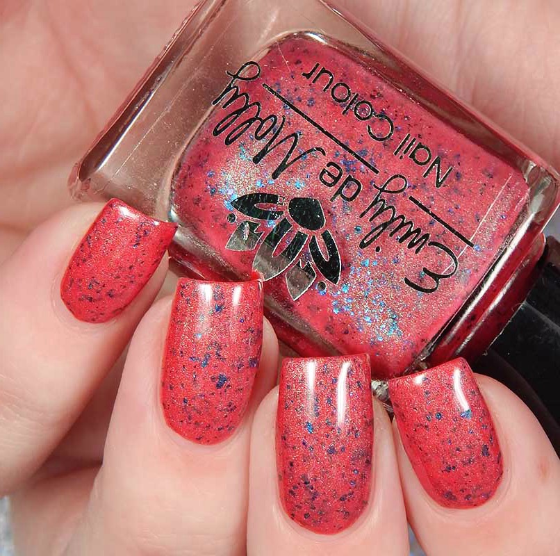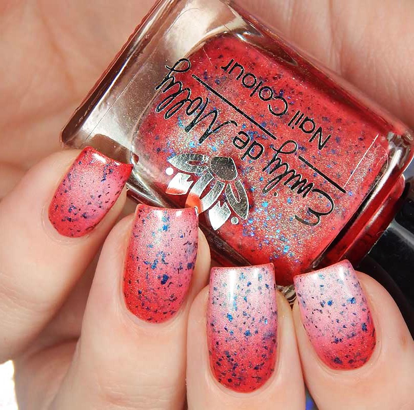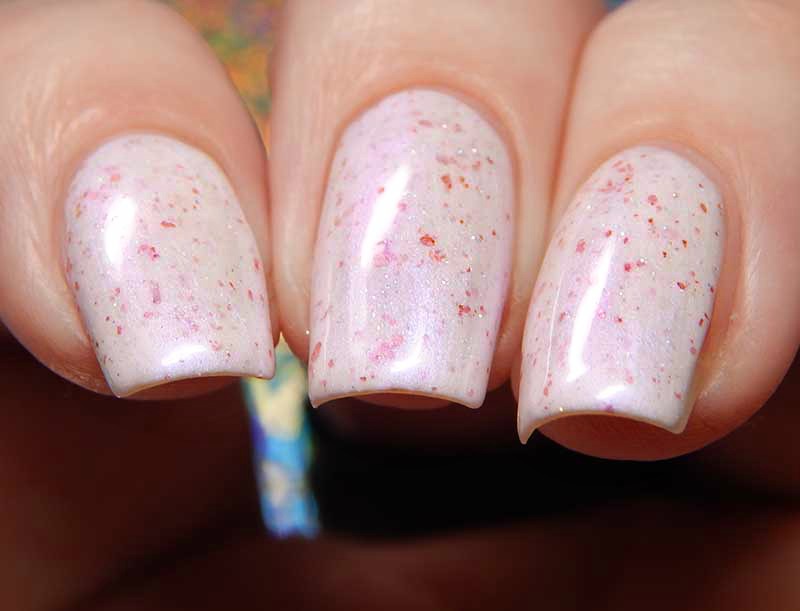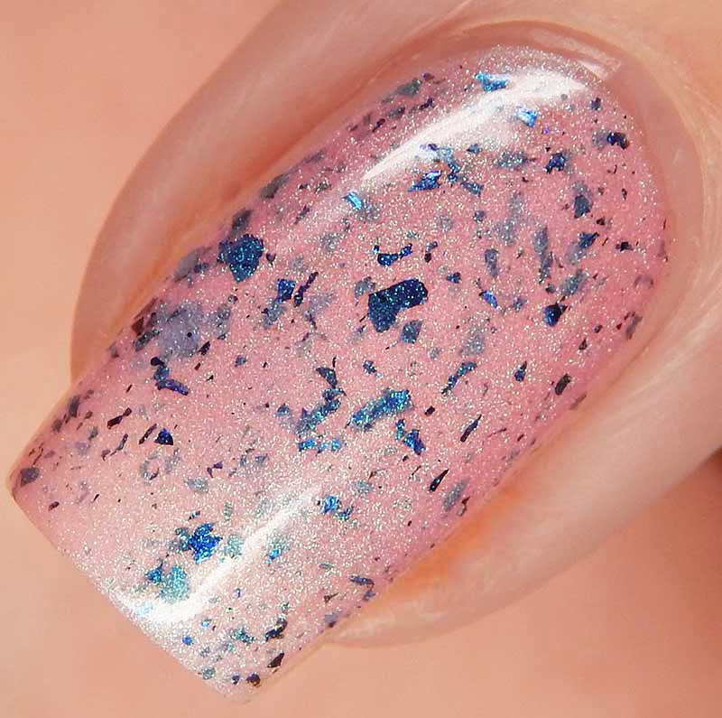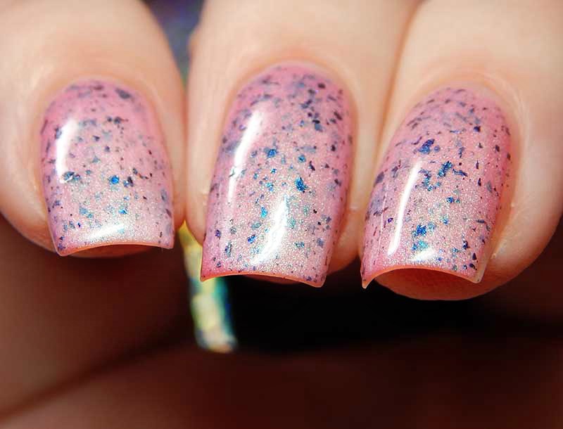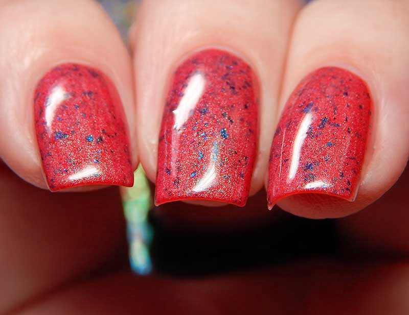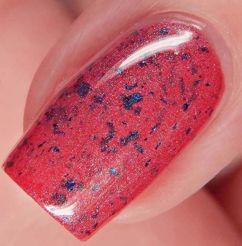 Modern Muse is a pink leaning red when cold to pale pink when warm. It also contains turquoise shimmer and blue chrome flakes. I used 3 thin coats and a glossy top coat for these photos.