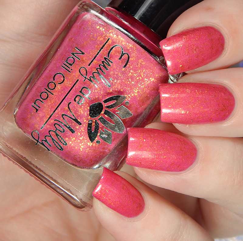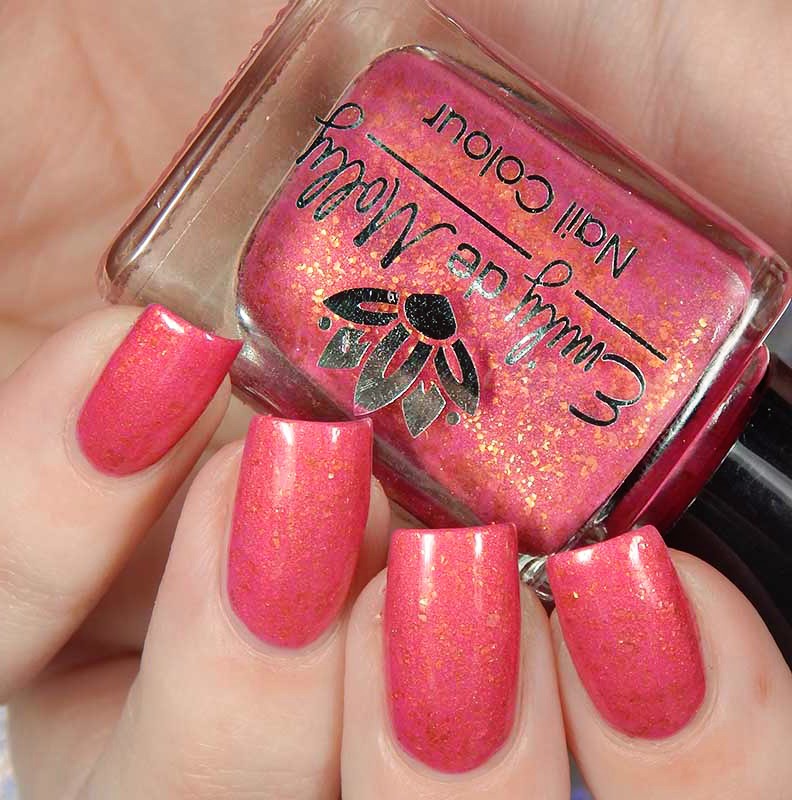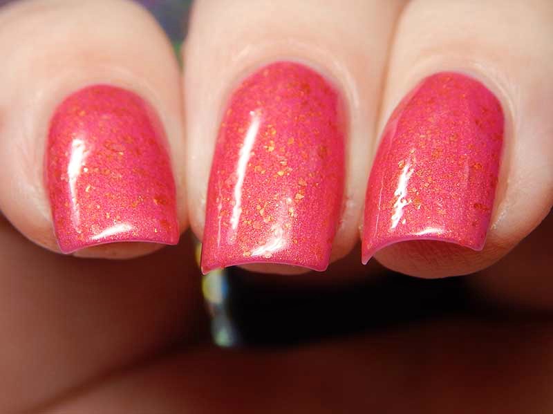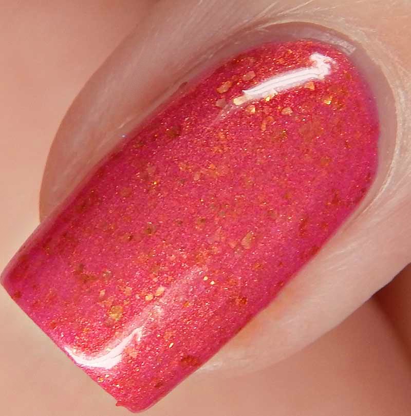 Embellished Response is a bright fuchsia pink with gold shimmer and gold flakes mixed in. I used 3 thin coats and a glossy top coat for these photos.