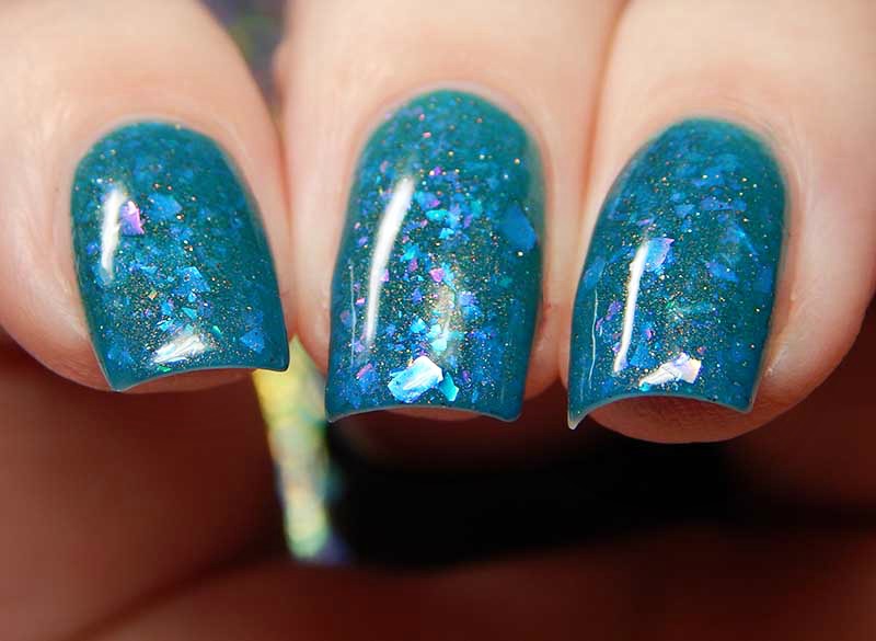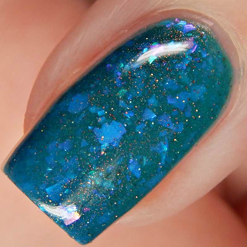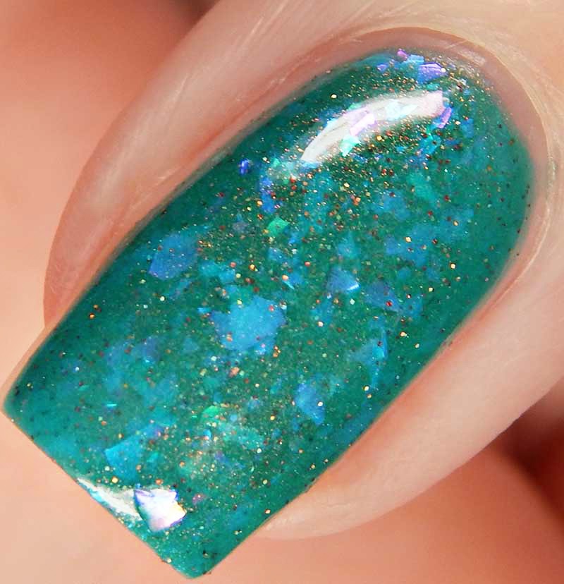 Jaded Visions is the first of two new thermals we’ll be looking at tonight. Jaded Visions is a dark teal blue when cold and shifts to a light teal green when warm. It also has copper shimmer and green to blue to purple iridescent flakes mixed in. I used 3 thin coats and a glossy top coat for these photos. Depending on how thick your coats are, you might need 2 coats of top coat to smooth over all the flakes.