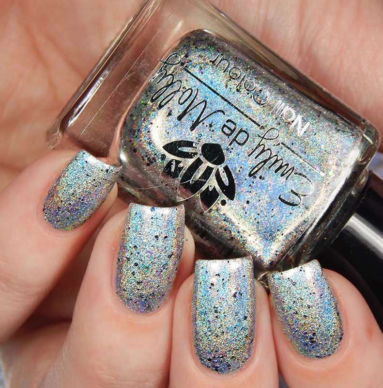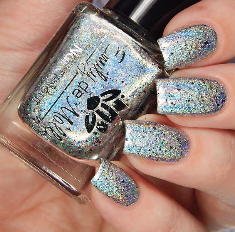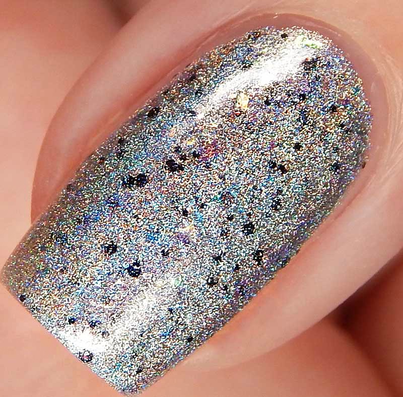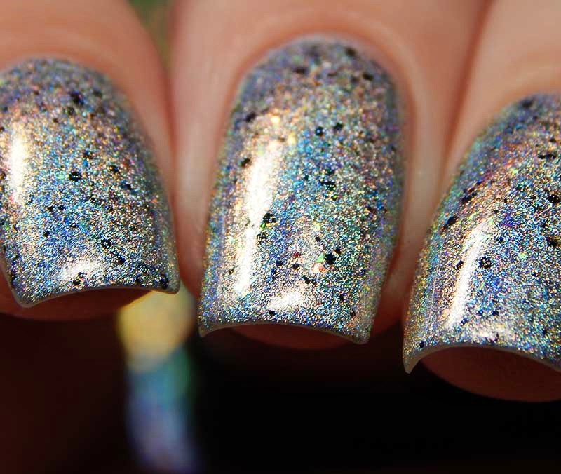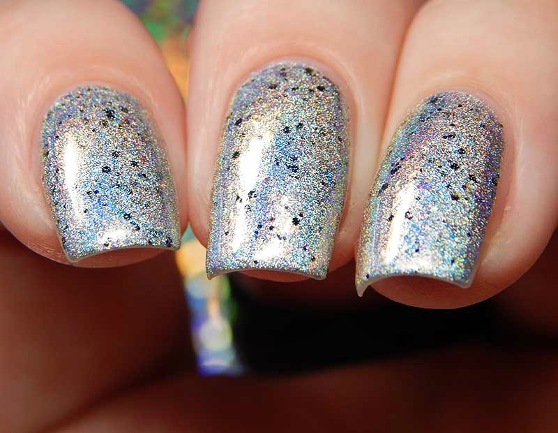 Linked Irony is one of my favorites from this set. This is a super silver linear holographic with gold ot pink to green iridescent flakes and black micro glitters mixed in. I used 3 thin coats and a glossy top coat for these photos.