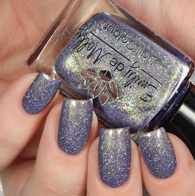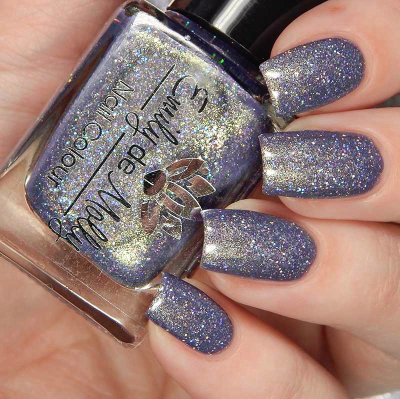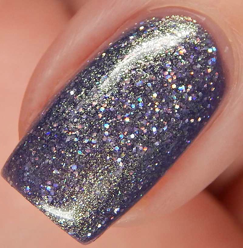 Little Whispers is a slightly dusty lighter purple crelly base with gold to green shifting shimmer and silver holo microglitters added in. I used 3 thin coats and a glossy top coat for these photos.