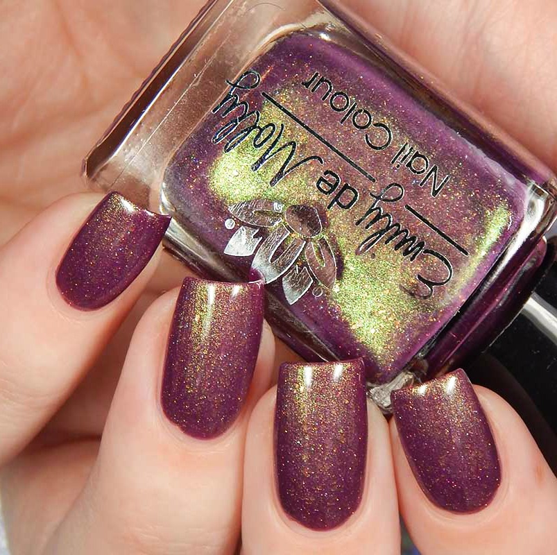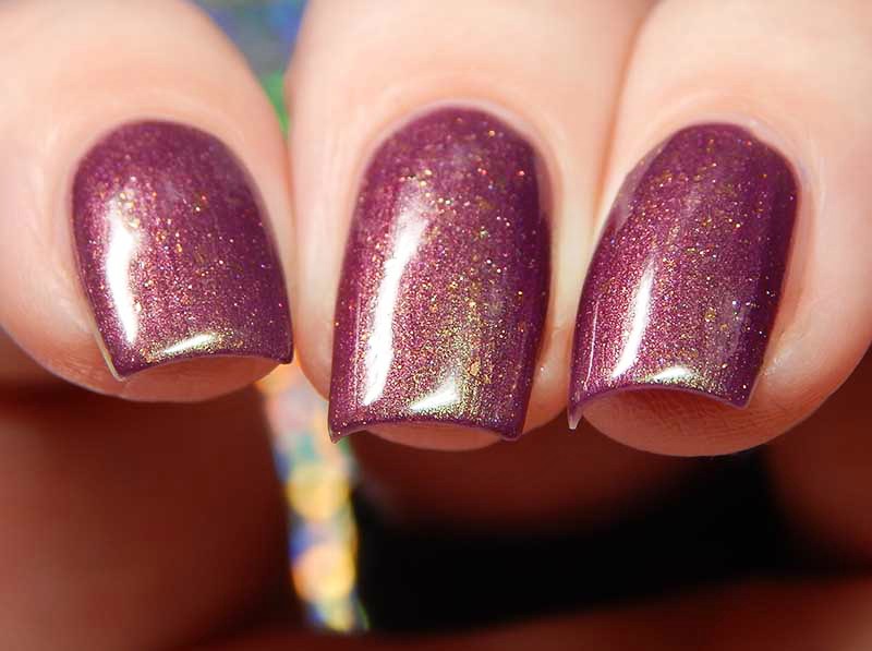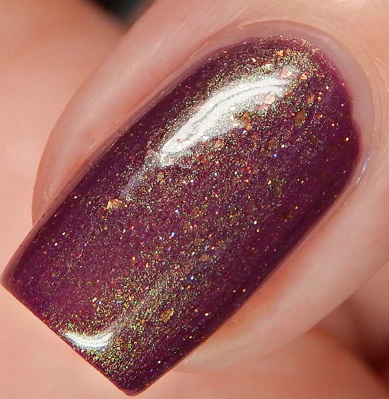 The final shade tonight is Ruined Cities. This is a red toned plum creme base with green to pink shifting shimmer, copper micro glitter and gold flakes. I used 3 thin coats and a glossy top coat for these photos.