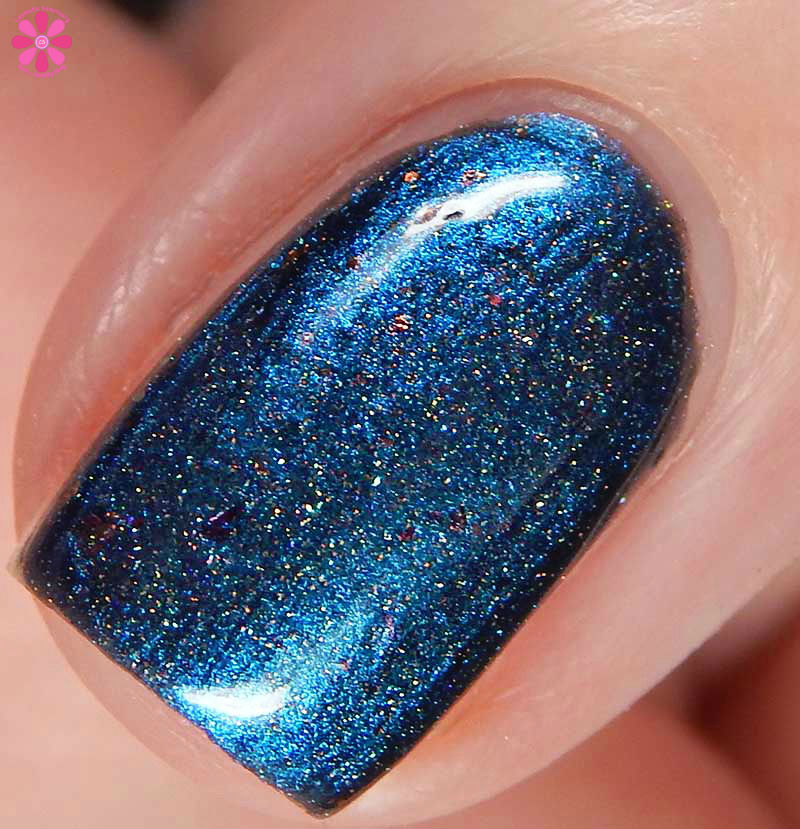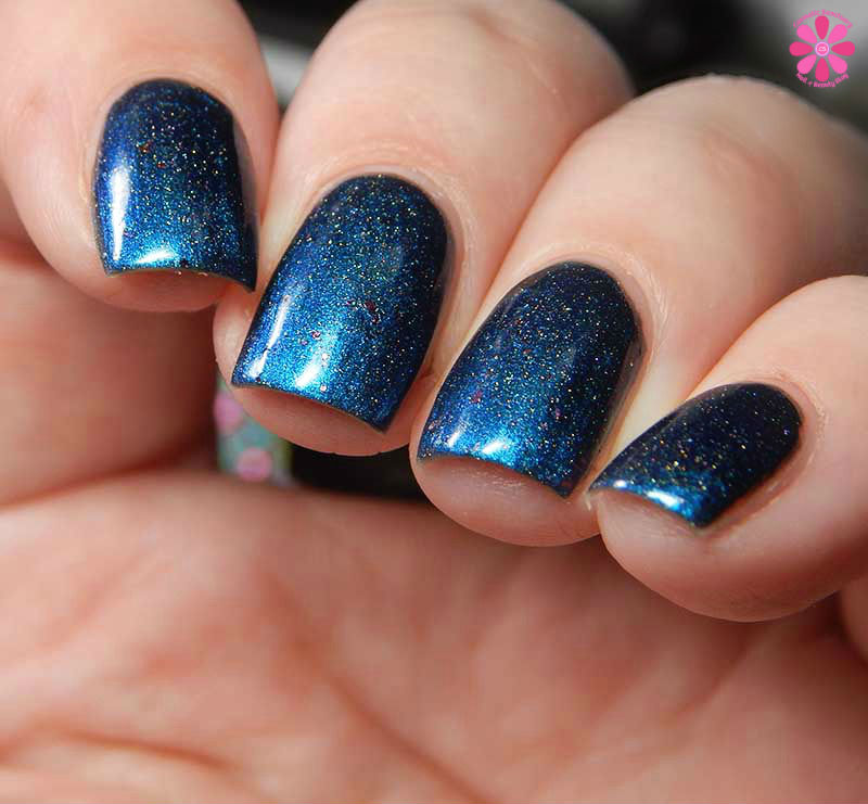 Fair Maiden Polish Falling Stars is a metallic deep blue that has an incredibly subtle purple shift at extreme angles, but I couldn’t actually capture it to show off. It also has ultra chrome flakes that shift from magenta to copper to gold, chameleon glitters that shift red to gold to green, and a very light scattered holographic. I used 2 coats and a glossy top coat for these photos.
