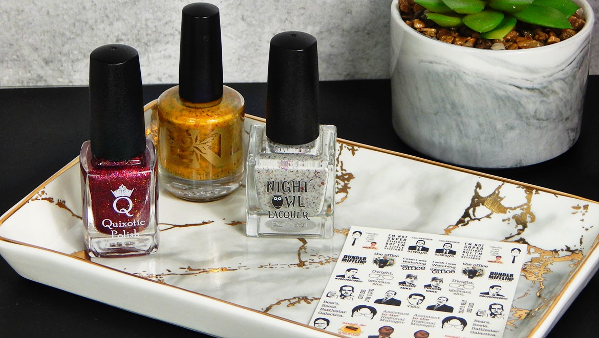 For the August Fandom Flakies Box we have Night Owl Lacquer & Bee’s Knees Lacquer (as usual) and this month Quixotic Polish is the guest maker, and Ribbits Stickits worked their magic with a water slide decal sheet with memorable The Office decals!