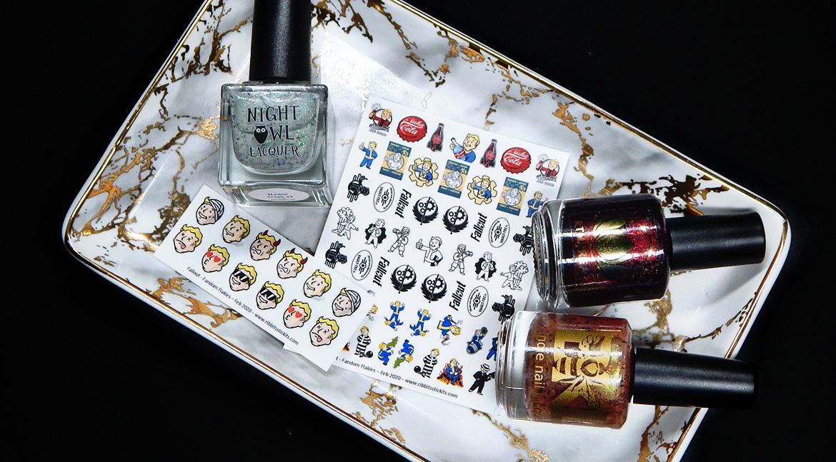 Okay – let’s talk about this box. The Fandom Flakies Box February 2020 Fallout box will feature Bee’s Knees Lacquer, Night Owl Lacquer, and the guest maker is Ethereal Lacquer! Ribbits Stickits is back this month after a 2 month absence, and I’m glad to see her add on decals back!