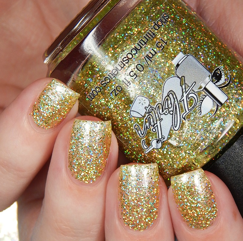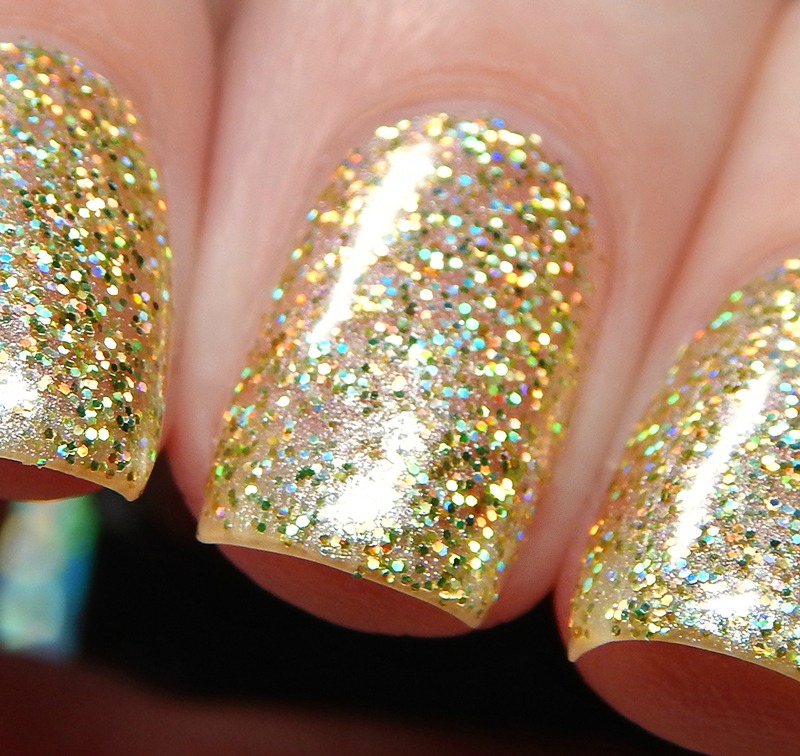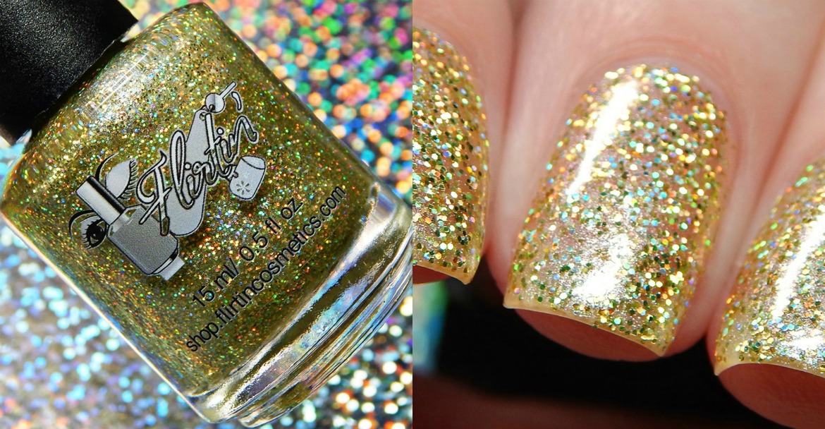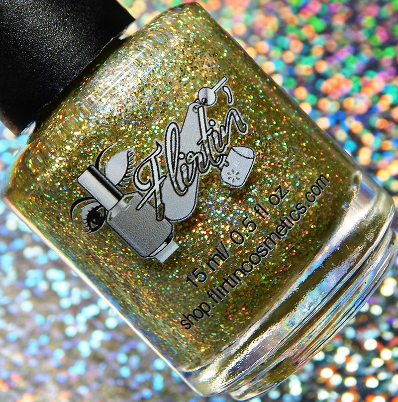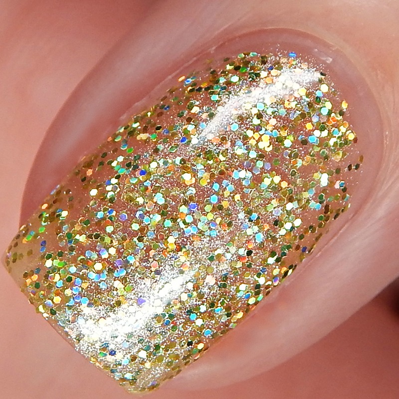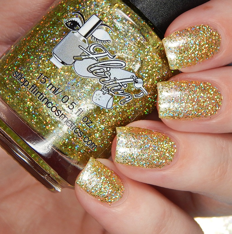 Flirtin’ Cosmetics Essence Of A Goddess is a sheer golden jelly base with the slightest hint of chartreuse, loaded with lime micro and small holographic glitters that really make this one sparkle! In person you can see a touch more chartreuse tones. My camera pulled more gold.