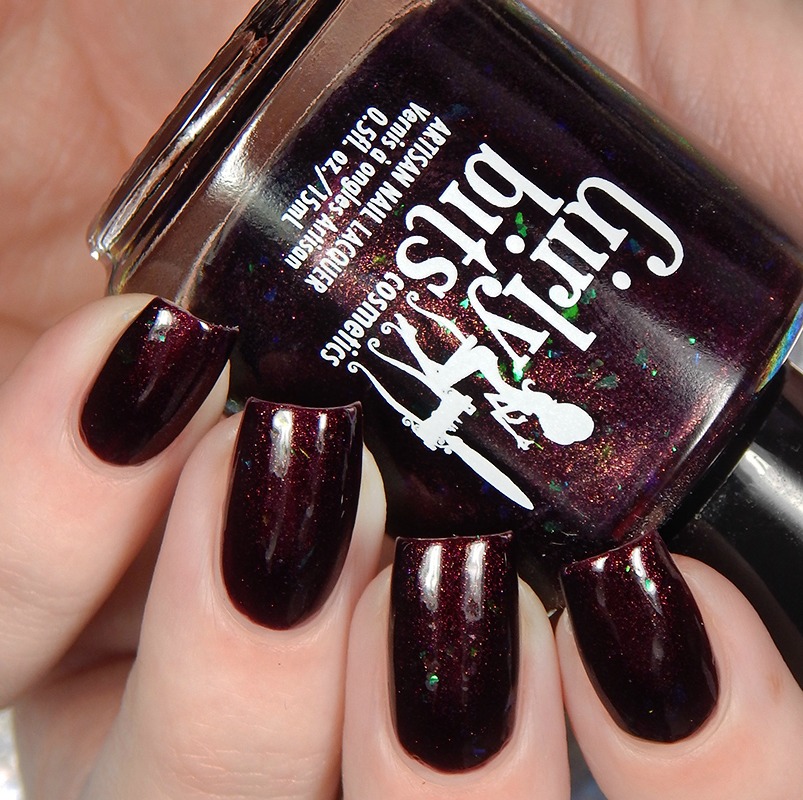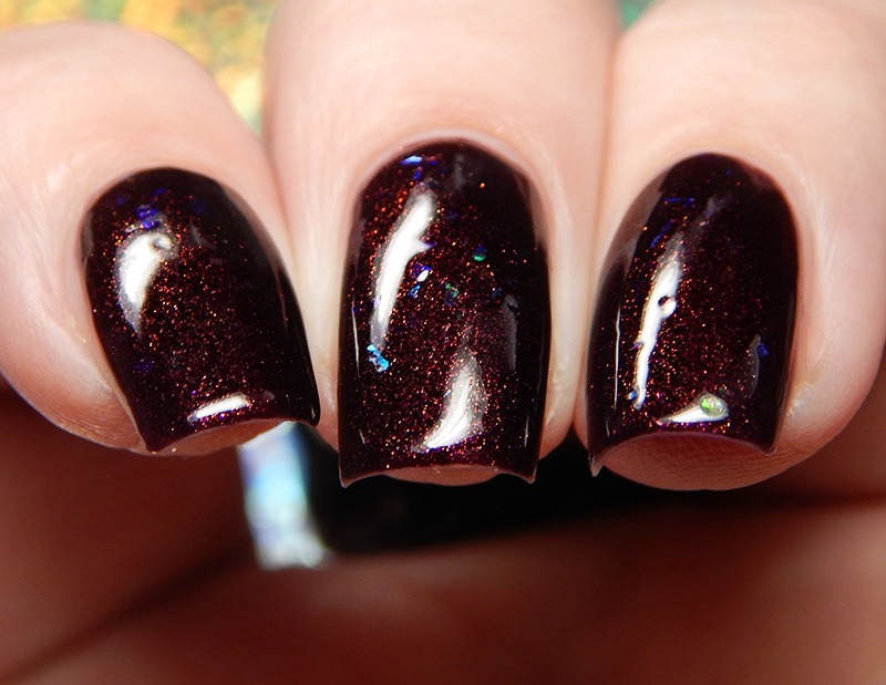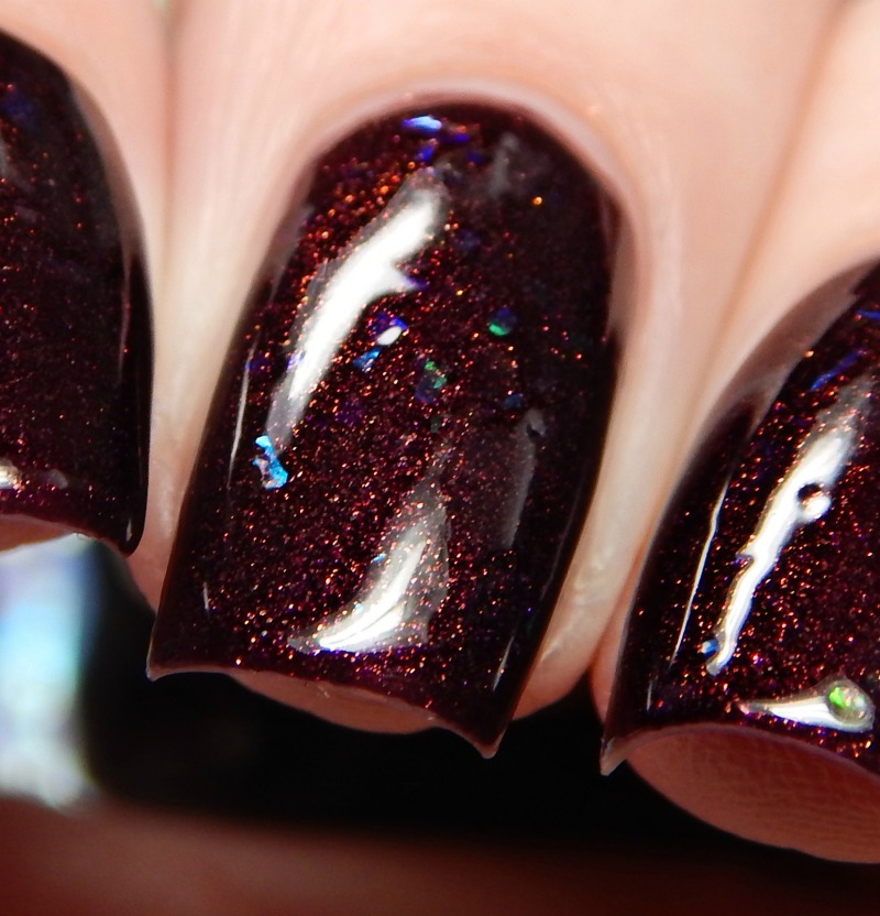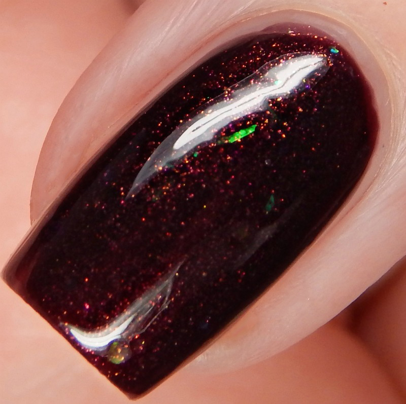 Dark Reflection is a maroon/dark wine shimmer with green to blue shifting iridescent flakes. I used 3 thin coats and a glossy top coat for these photos.