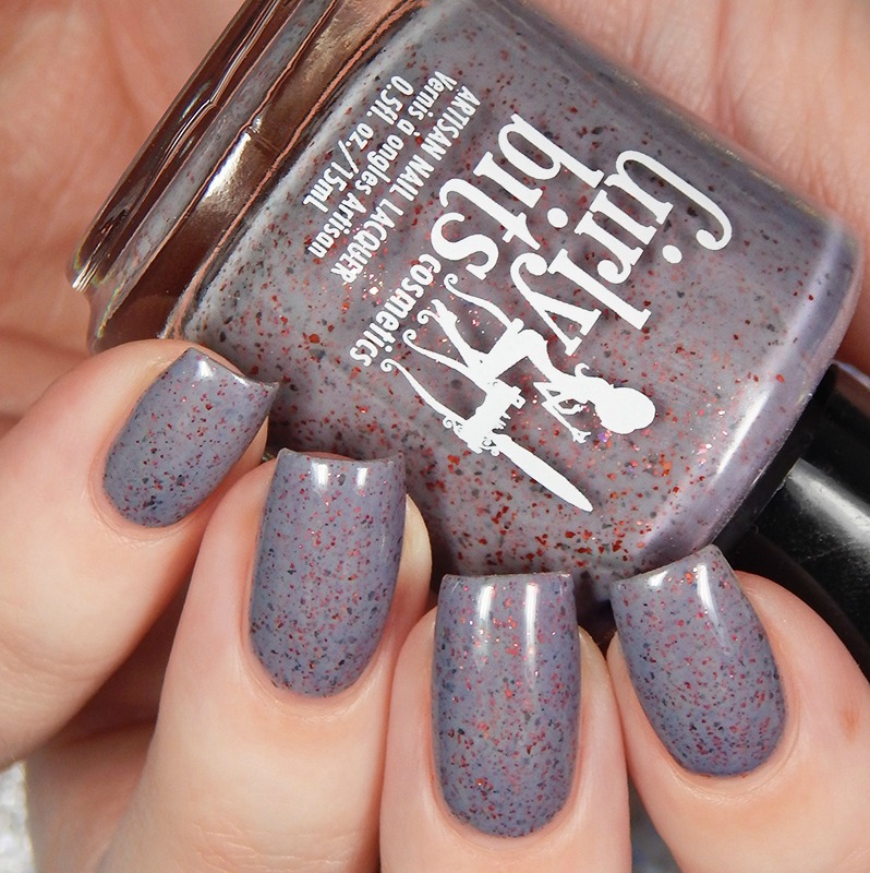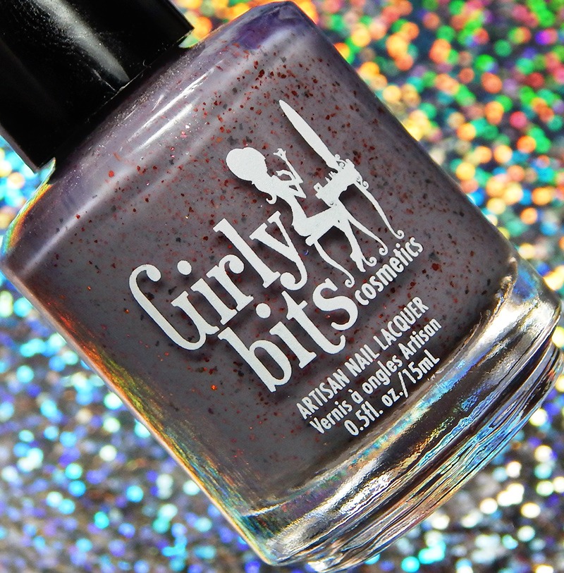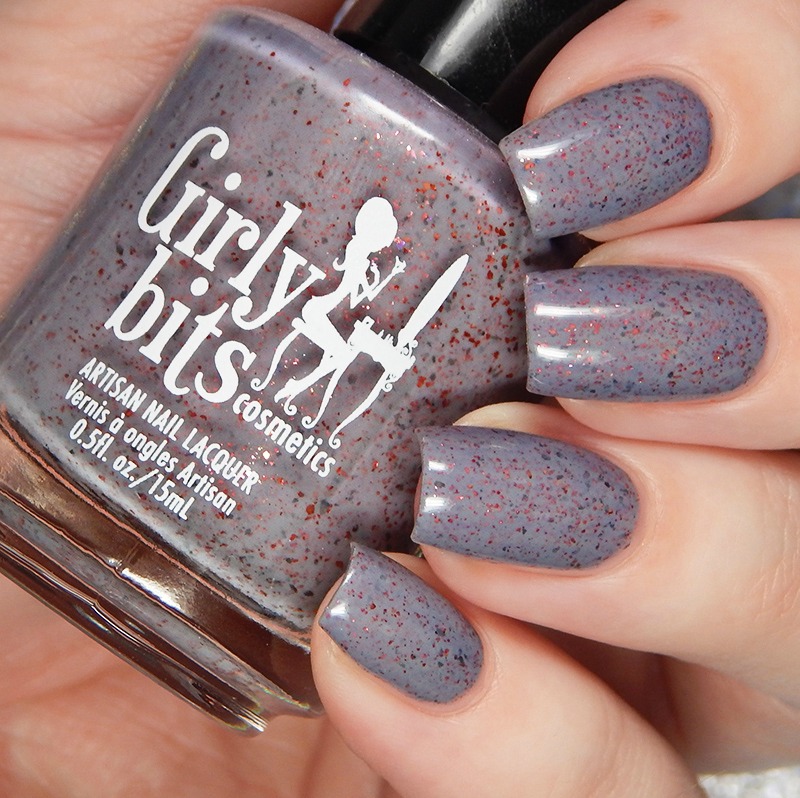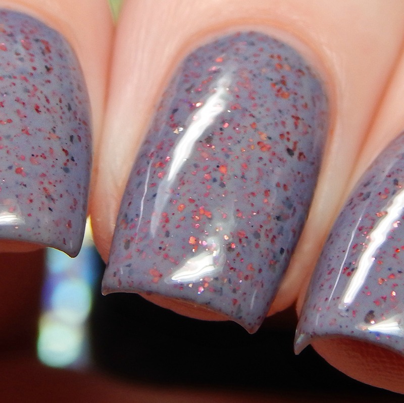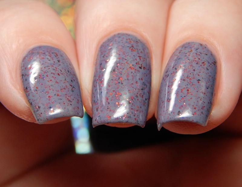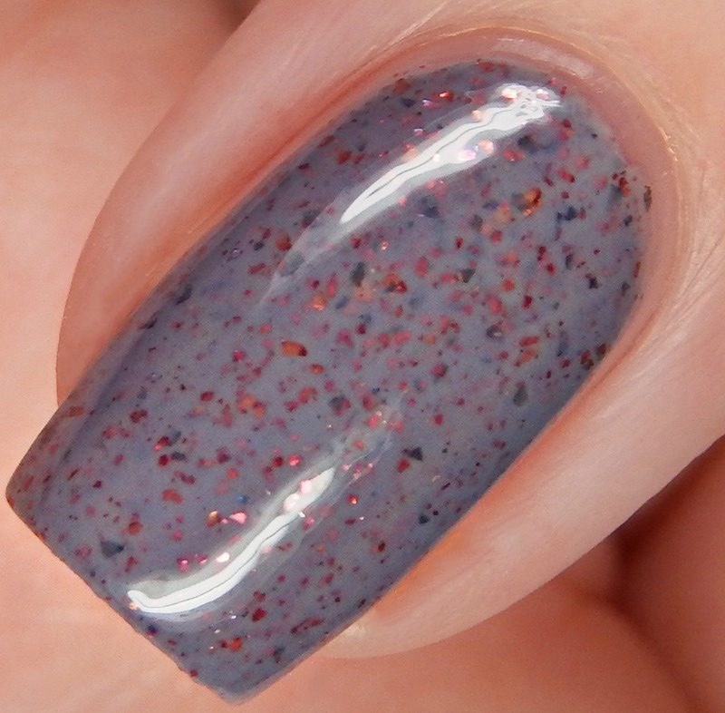 You Look Mauvelous is a medium dusty purple crelly base, with red metallic flakes and grey metallic flakes. I used 2 coats and a glossy top coat for these photos.