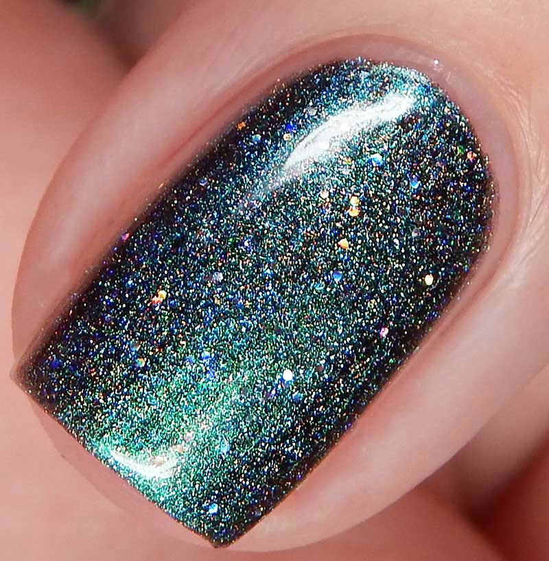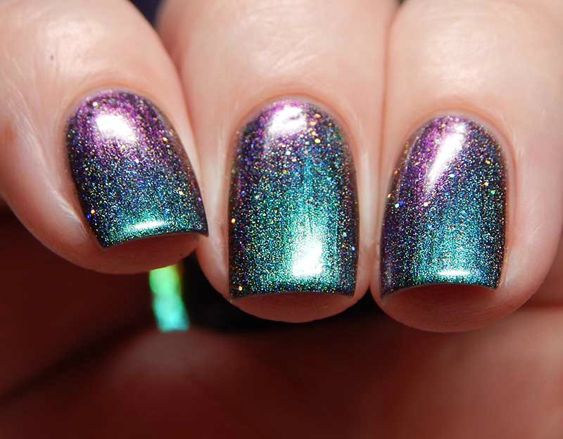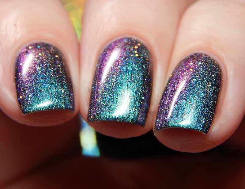 After Midnight is a blue to purple to green multichrome linear holographic with added holographic microglitters. I used 2 coats and a glossy top coat for these photos. The added holo glitters really add a special spark to this and I adore it! Especially on my newer short nails.