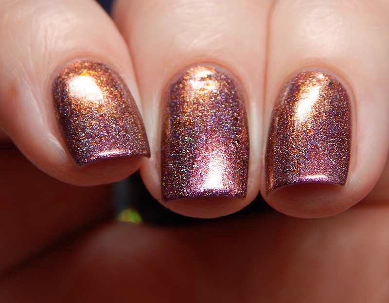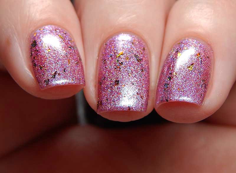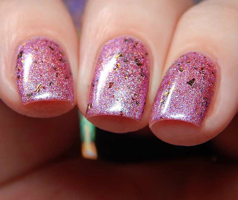 Before Dawn is a medium candy pink linear holographic loaded up with red to copper ultrachrome chameleon flakes and fine aqua shimmer. I used 3 thin coats and a glossy top coat for these photos.