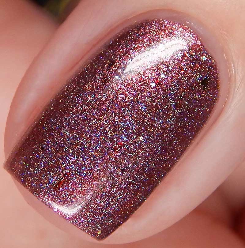 Cake & Confetti is a garnet red to copper duochrome linear holographic with added flakes and red shimmer. I used 2 easy coats and a glossy top coat for these photos.