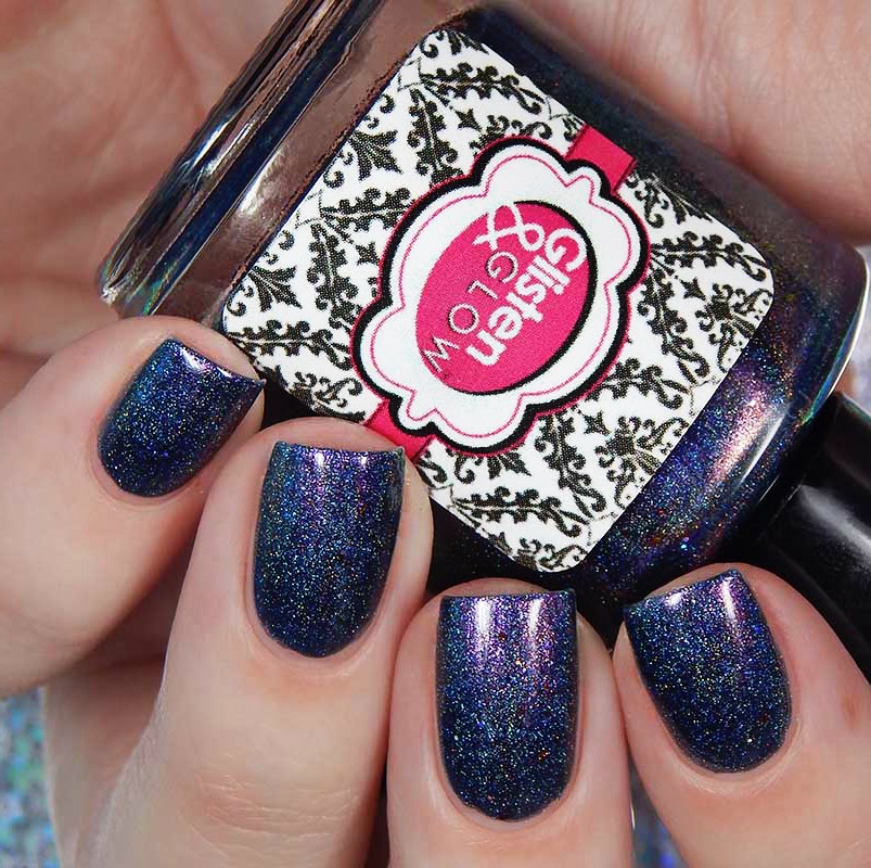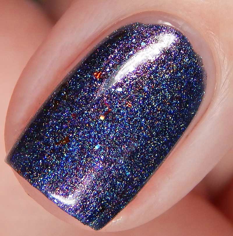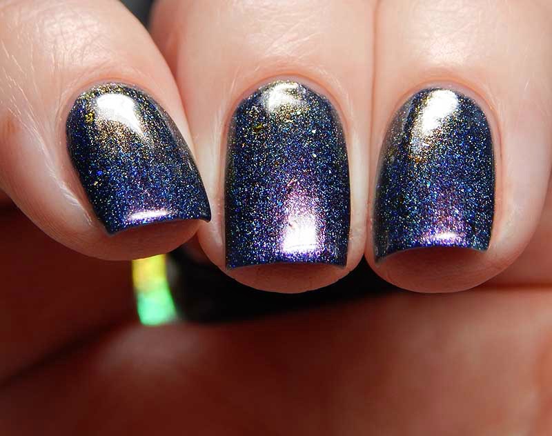 Dinner & Drinks is a navy blue to purple duochrome linear holographic with pink shimmers and ultrachrome chameleon flakes, as well as galaxy holographic microglitters. I used 2 coats and a glossy top coat for these photos.