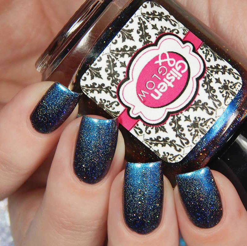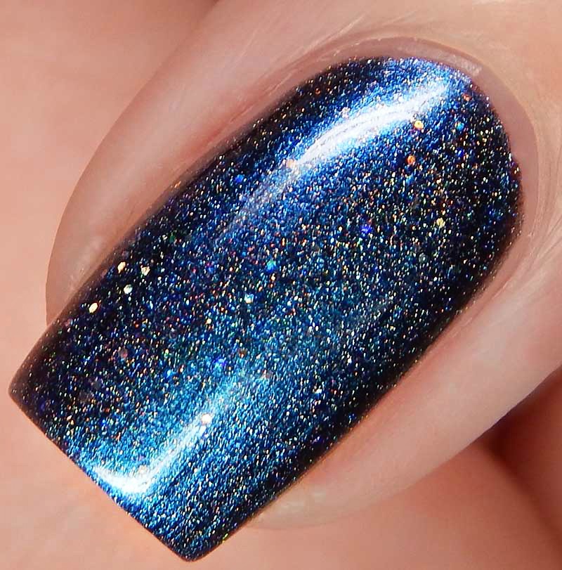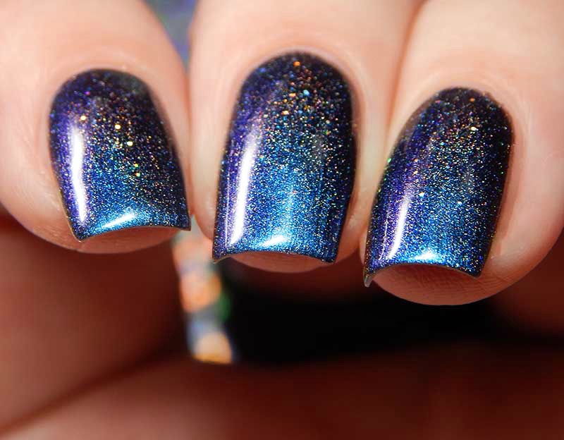 Her Majesty’s Navy is a blue to purple to aqua multichrome linear holographic with silver galaxy holo micro glitters. I used 2 easy coats and a glossy top coat for these photos.