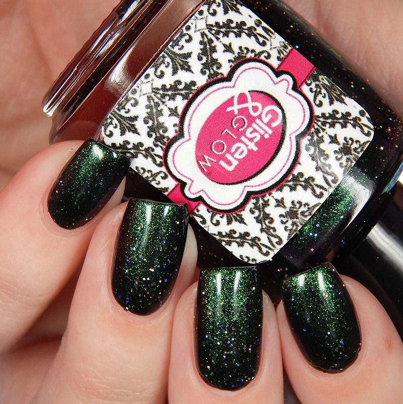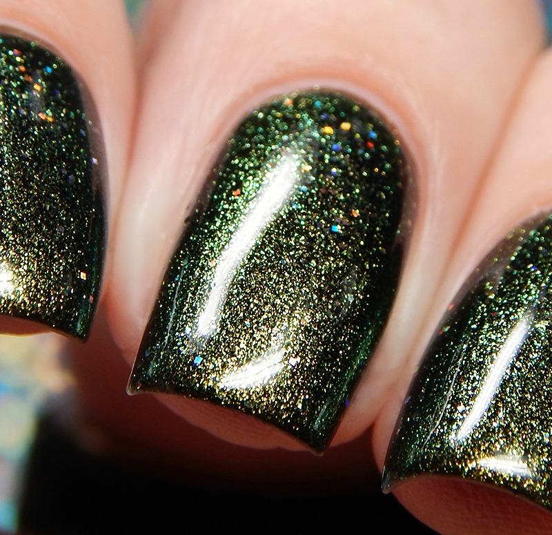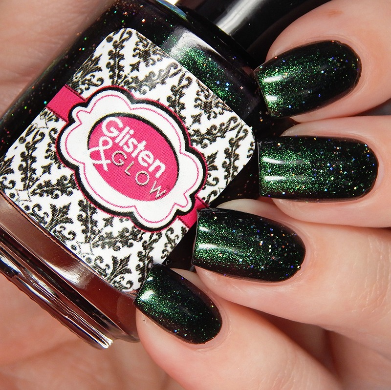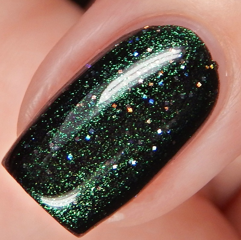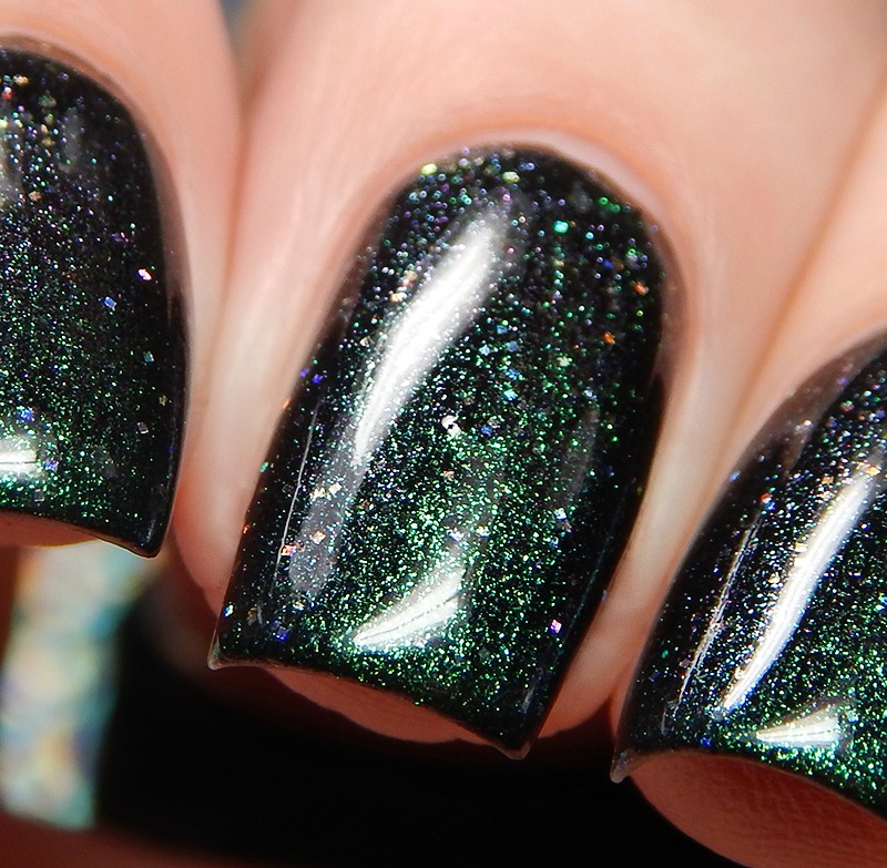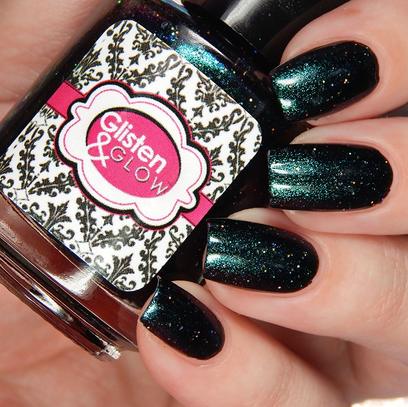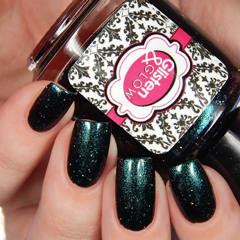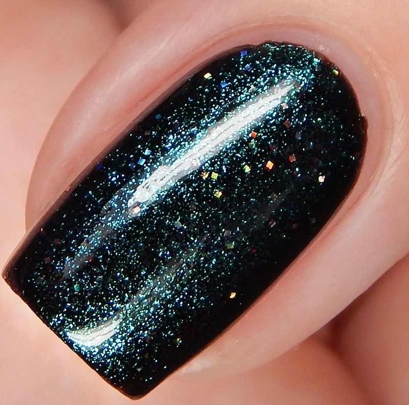 Leather & Lucille is a black base with blackened emerald shimmer with silver galaxy microglitters. I used 2 coats and a glossy top coat for these photos.