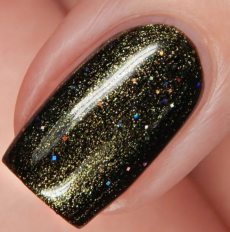 Black. Color of My Soul is a black creme base loaded with blackened golden olive shimmer and silver galaxy micro glitters. I used 2 coats and a glossy top coat for these photos.