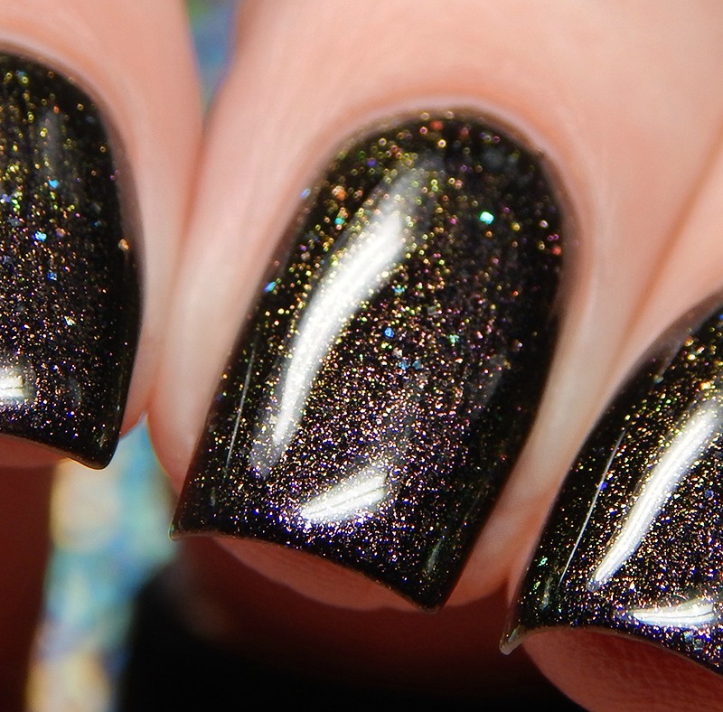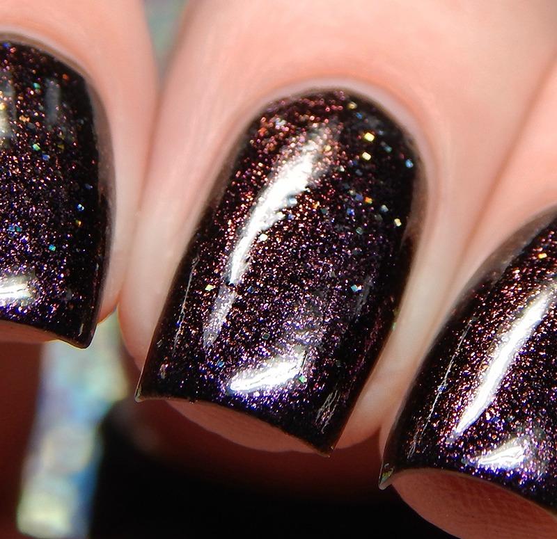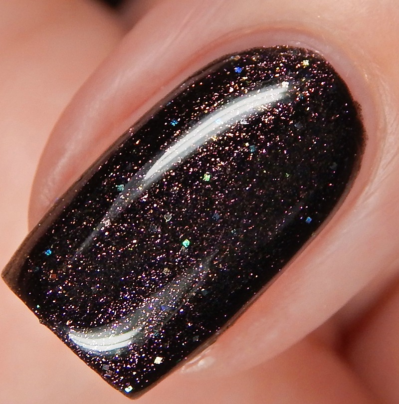 Coffee & Cuss Words is a black base loaded with blackened reddened bronze shimmer with silver galaxy microglitters. I used 2 coats and a glossy top coat for these photos.