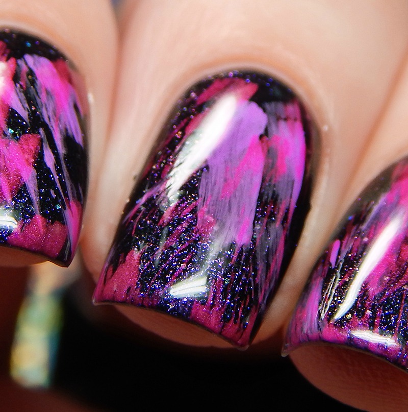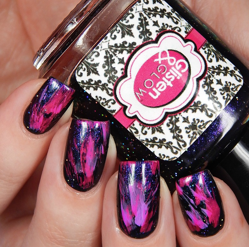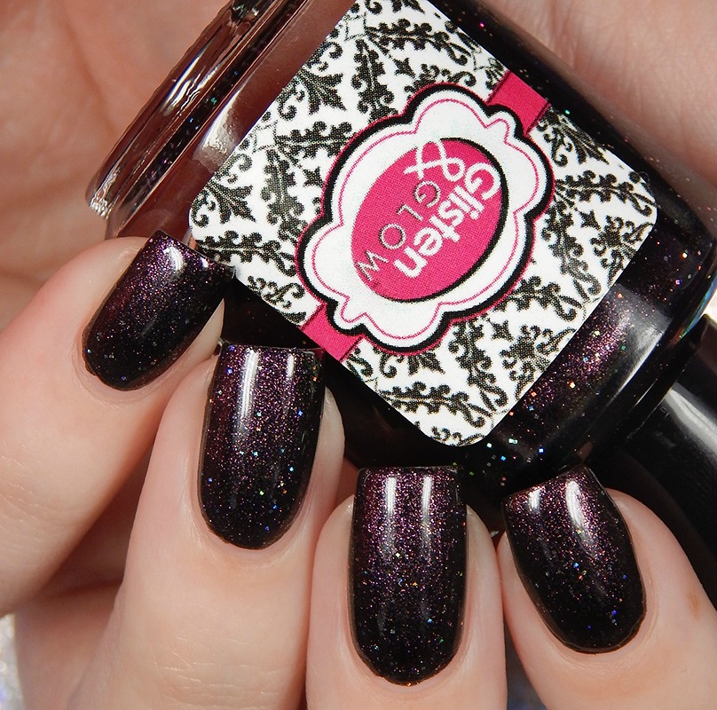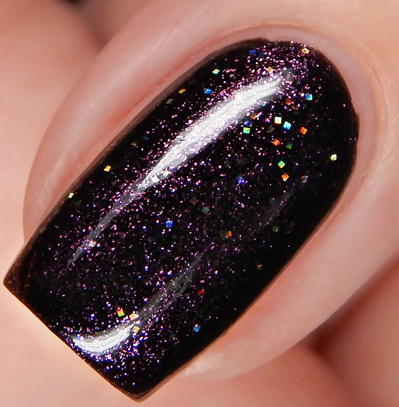 Sparkles & Skulls is a black base loaded with blackened fuchsia shimmer with silver galaxy microglitters. I used 2 coats and a glossy top coat for these photos.