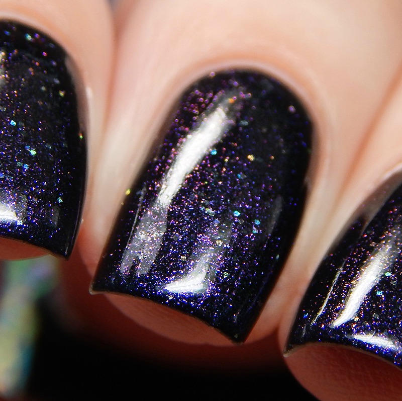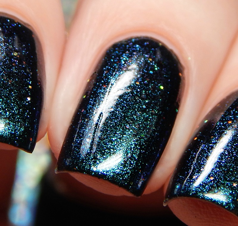 Cold Hands. Warm Heart. is a black base with blackened aquamarine shimmer that has a bit of an aqua to blue to purple shift to it. It also has galaxy microglitters. I used 2 coats and a glossy top coat for these photos.