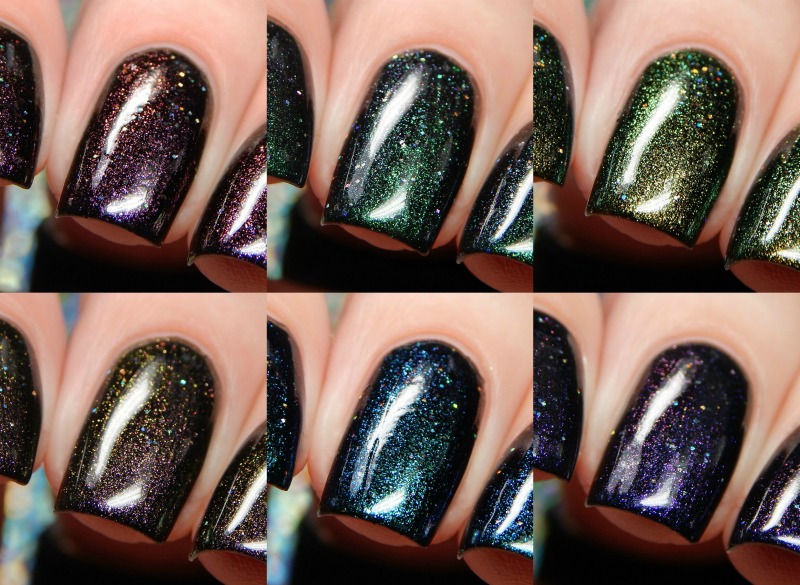 This is a 6 piece collection with dark bases and incredibly strong shimmer and holo microglitters. They are dark and mysterious, shimmery and a tad shifty!