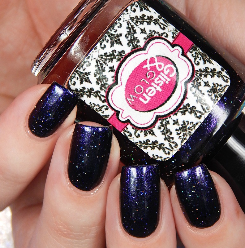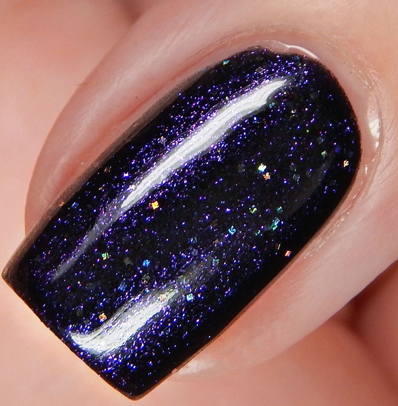 Sarcasm. My 2nd Language. is a black base loaded with blackened violet shimmer with silver galaxy microglitters. I used 2 coats and a glossy top coat for these photos.