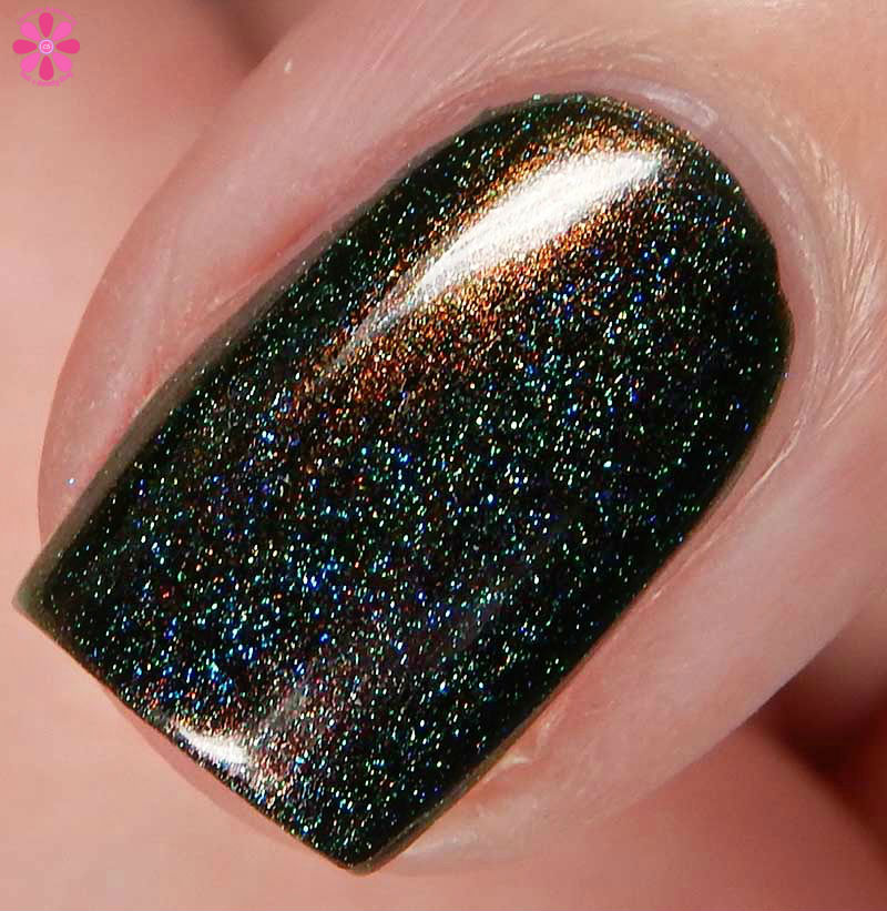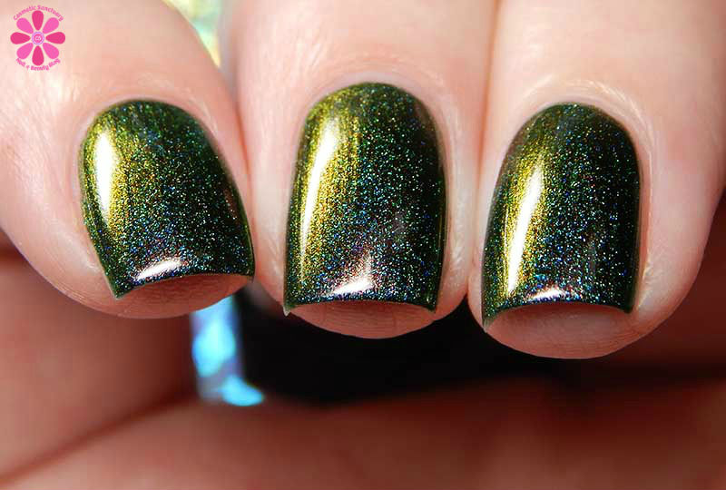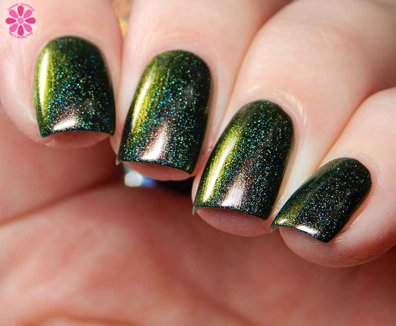 Great Lakes Lacquer O’Rlyeh? is a deep moss green linear holographic filled with multichrome shimmer that shows shifts of red, gold, green and at certain lighting you can see flashes of purple. I used 2 coats and a glossy top coat for these photos.