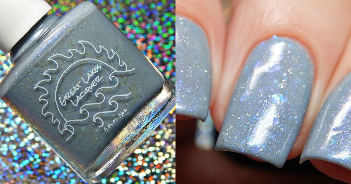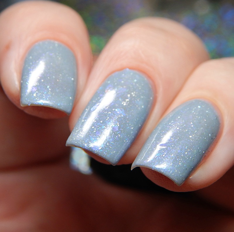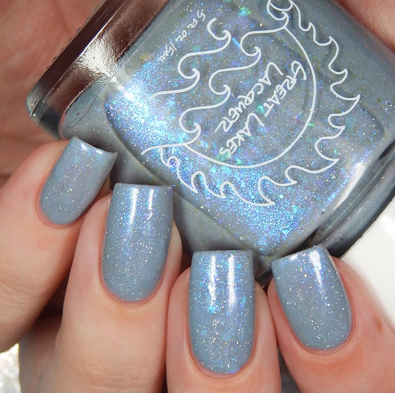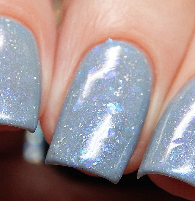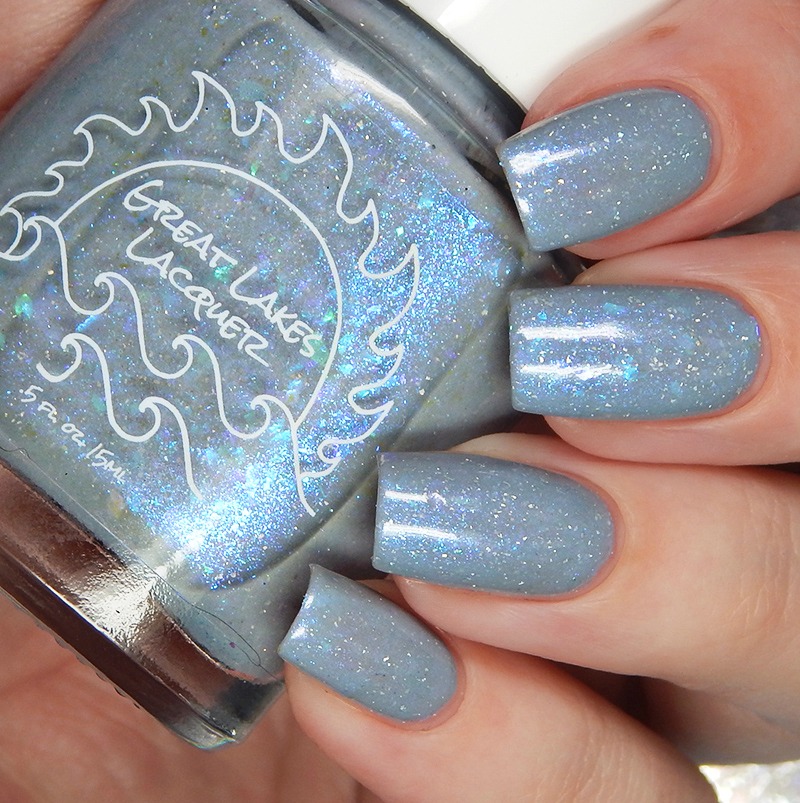 Great Lakes Lacquer Wicked. Tricksy. False. is a blue based light grey filled with glowing blue to purple shimmer, iridescent flakes with the same shift and holo micro flakes. I used 3 thin coats and a glossy top coat for these photos.