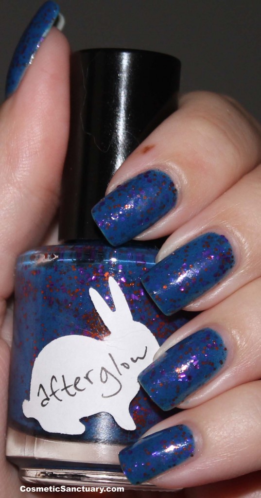 Afterglow is a medium navy blue base with coppery orange and purple hex glitter and small purple glitter. I used 3 coats for this mani and no “undies” . I got a good amount of glitter with each dip of the brush without it being “too much”. When I removed this one I had “patchy smurf nails” so use a good base coat with it :)