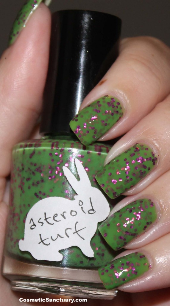 Asteroid Turf is a green base with magenta hex glitter. I used 3 coats of Asteroid Turf for this to reach the opacity I wanted.