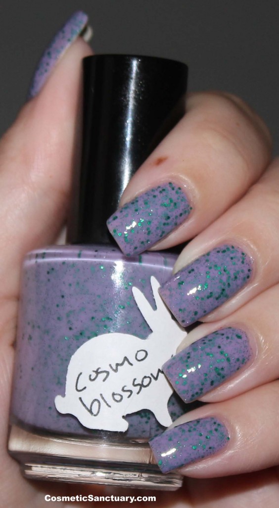 Cosmo Blossoms. I love you. This one is a gorgeous lavender base with small green glitters as well as slightly larger green hex glitter. Again, this is 3 coats.. but I love this color. The combo of lavender and green is just.. ugh. Love it.
