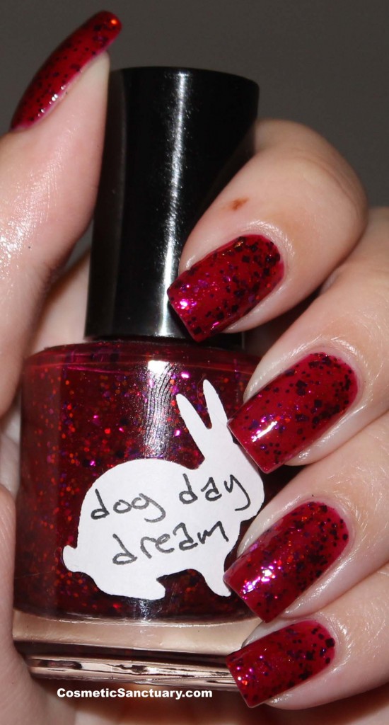 Dog Day Dream is a red jelly full of purple, fuschia, and orange glitter in various sizes of hexes and squares. This was another stunner. I used 3 coats for this one as well. I’m going to need a back up of this one.